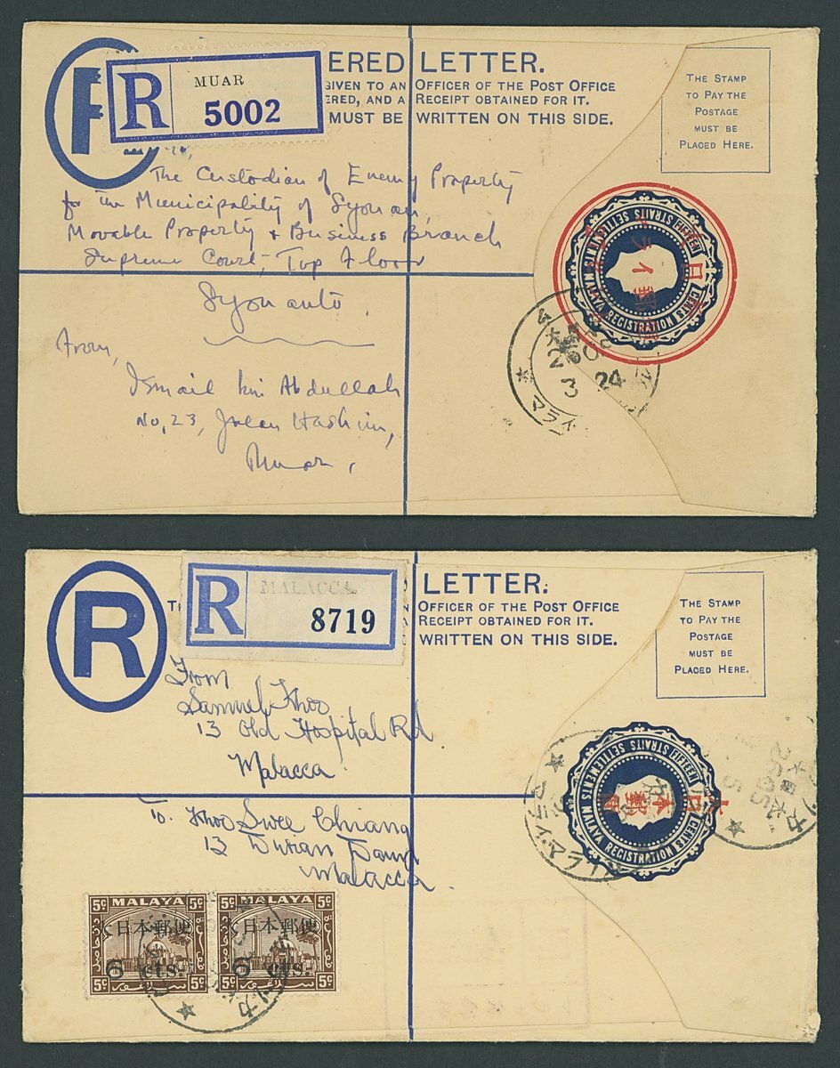 1945 (24 Mar.) and (5 Sept.) Straits Settlements 15c. registered envelopes, the former with Kanji in circle overprint from Muar to Singapore cancelled with Japanese type c.d.s., the latter with red Kanji overprint locally addressed at Malacca, bearing Selangor 6c. on 5c. pair with Kanji overprint cancelled with Japanese type c.d.s.; fine