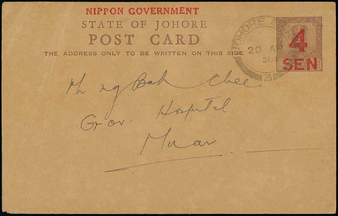 1942 (20 Apr.) Official 4s. on 4c. stationery card to Muar, cancelled by