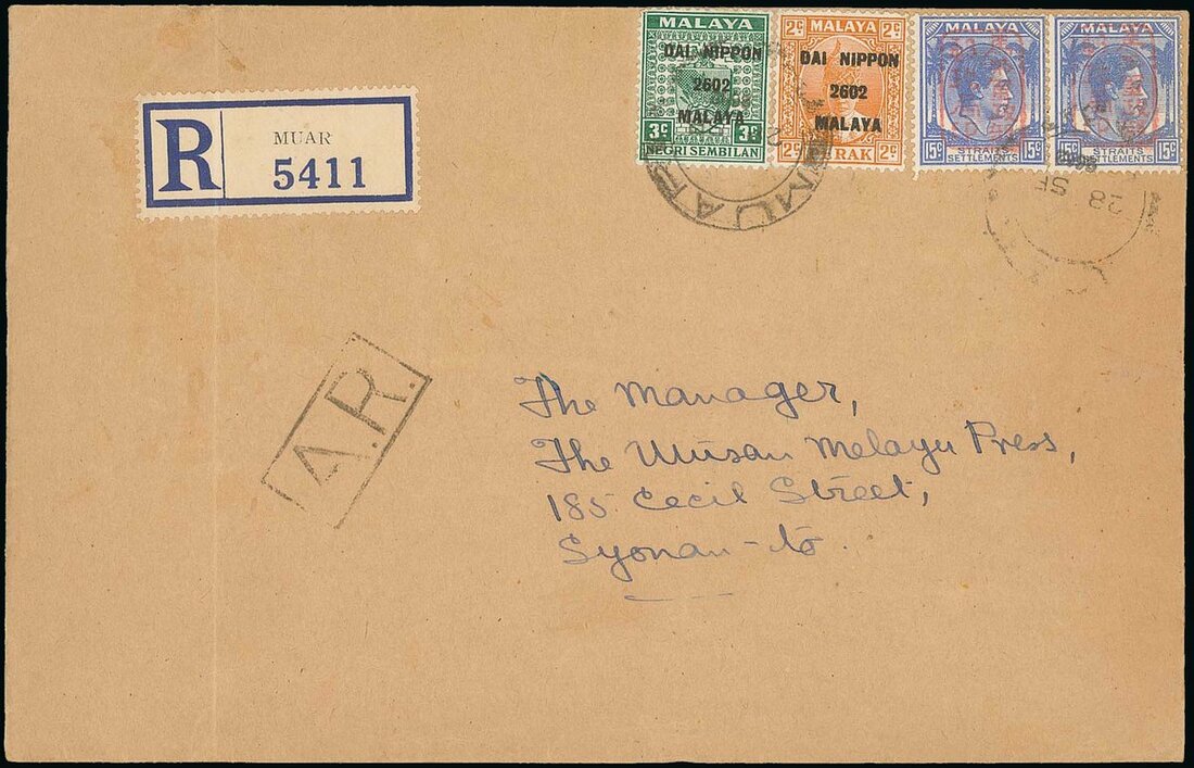 1942 (28 Sept.) envelope registered to Singapore, bearing single frame chop in red on Straits Settlements 15c. pair with Negri Sembilan 3c. and Perak 2c. with