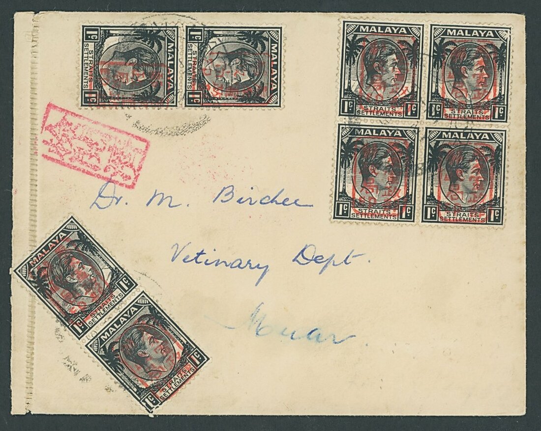 1942 (21 May) envelope to Muar, bearing single frame chop in red on Straits Settlements block of four and vertical pairs (2), all tied by