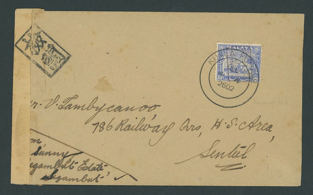 1942 (4 Apr.) envelope to Sentul, bearing single frame chop in violet on Selangor 15c. (Type E, upright) neatly tied by Kuala Lumpur double-ring d.s. (Type D32), showing sealing tape at left tied by black censor chop and arrival datestamp (Type D4) on reverse, fine. S.G. J216b.