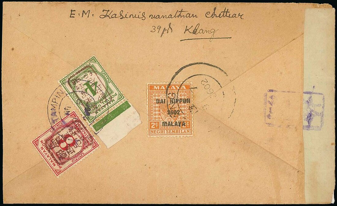 1942 (7 Sept.) envelope from Klang, Selangor to Tampin bearing, on reverse, Negri Sembilan 2c. with