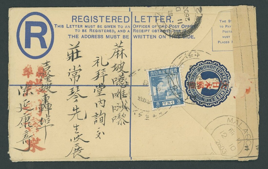 1943 (3 Dec.) Johore 15c. registered envelope (size G) with red Kanji overprint from Sungei Buloh to Maur, bearing Pictorial 8c. tied by Japanese Type JD2 c.d.s., showing Malacca transit d.s. (10.12) alongside with, on reverse, Kuang registration label with manuscript S Buloh in red ink and red censor chop. ISC RE12. MSG rated D