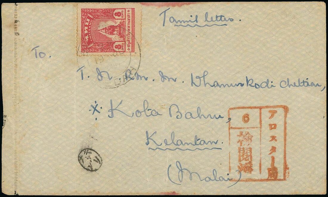 Undateable envelope from Alor Star to Kota Bahru, Kelantan bearing War Memorial 8c. carmine tied by light