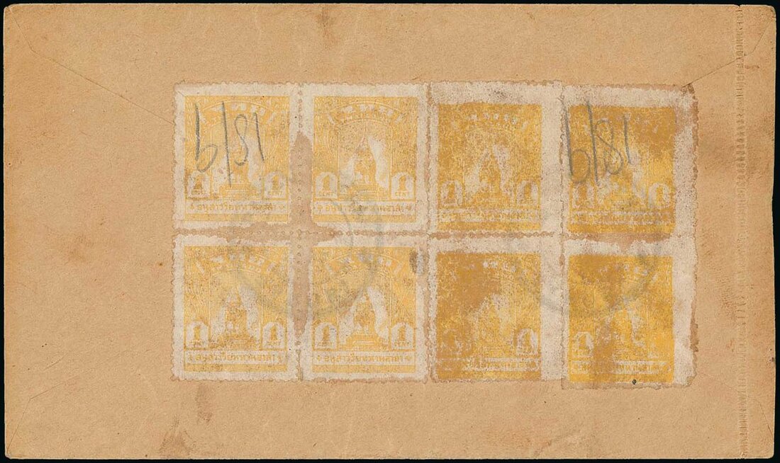 Undateable envelope from Alor Star to a friend in the Azad Hind Training Camp at Seremban bearing, on reverse, War Memorial 1c. yellow block of four and two vertical pairs, both with light central cancellations and showing, on face, two different censor chops; both blocks with affixative staining. Rare. Photo