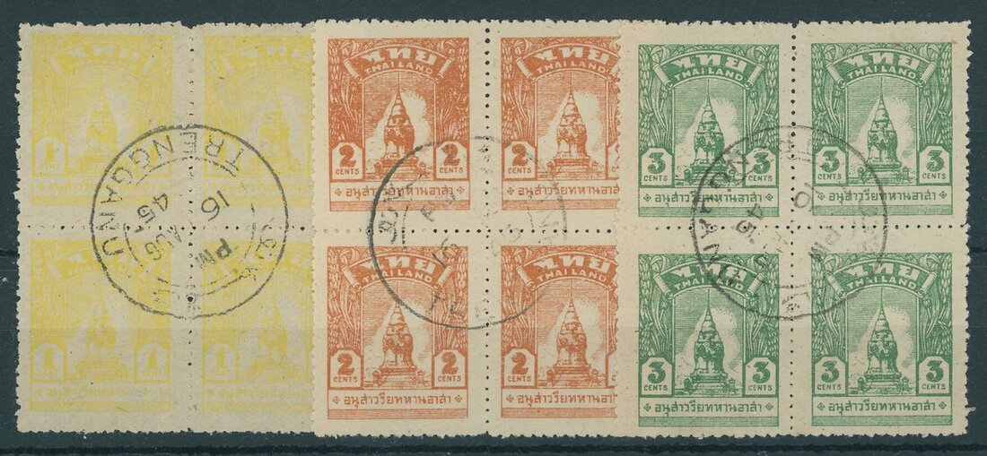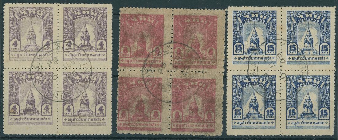 1944 War Memorial 2c. to 15c. set of six in blocks of four, the 8c. perf 12½x11, the others perf 12, each centrally cancelled by bi-lingual