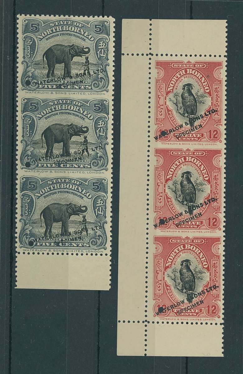 1909-23 5c. black and slate-grey and 12c. black and carmine, both in vertical strips of three imperforate between with the foot and the lower left corner of the sheet respectively, overprinted "