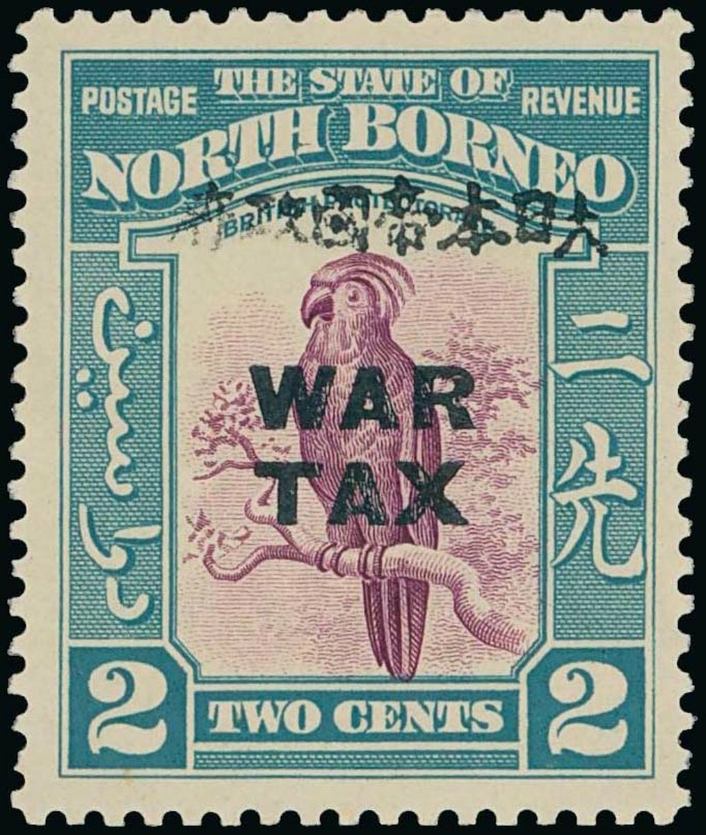 1942 overprinted in black on War Tax 2c. purple and greenish blue, large part original gum with faint horizontal bend otherwise fine and scarce. S.G. J17, £2,750. Photo