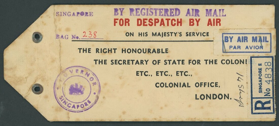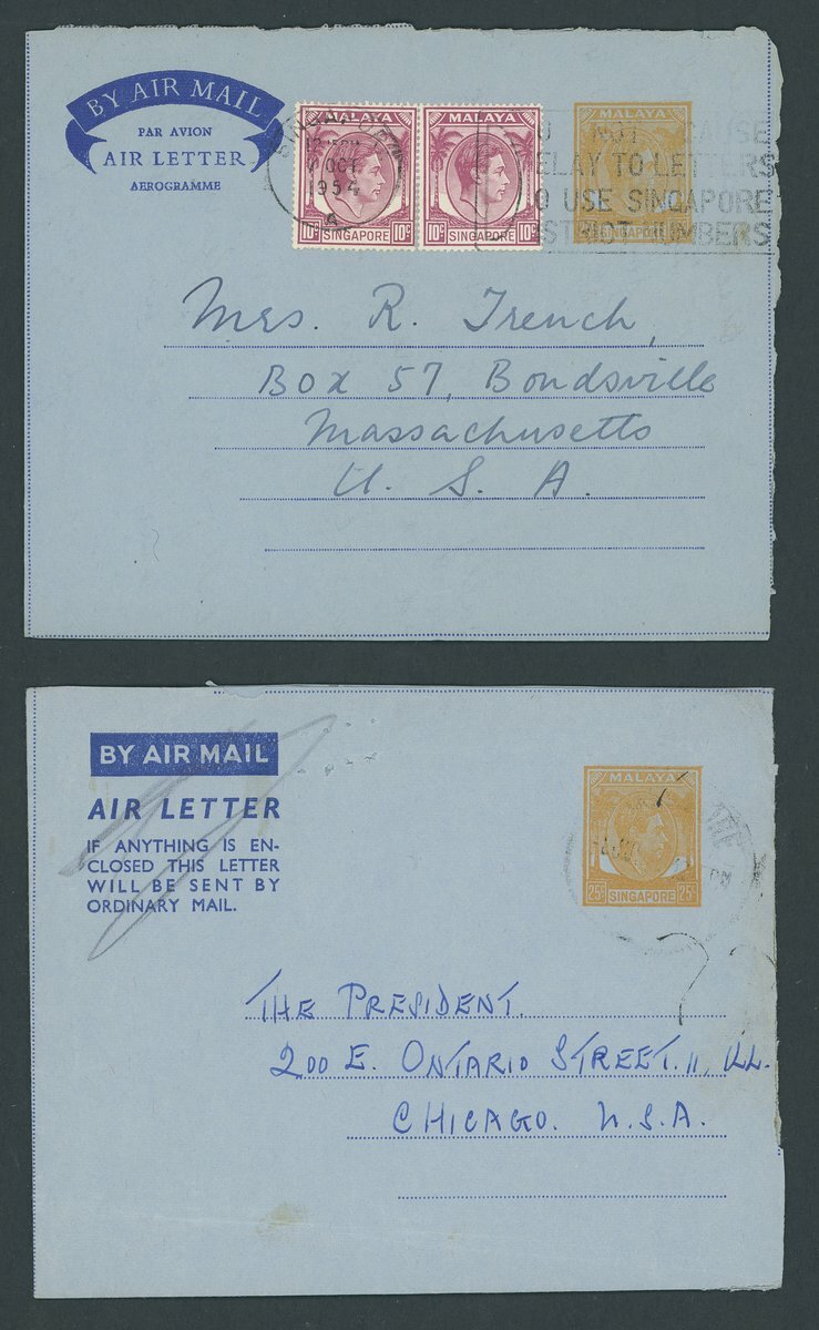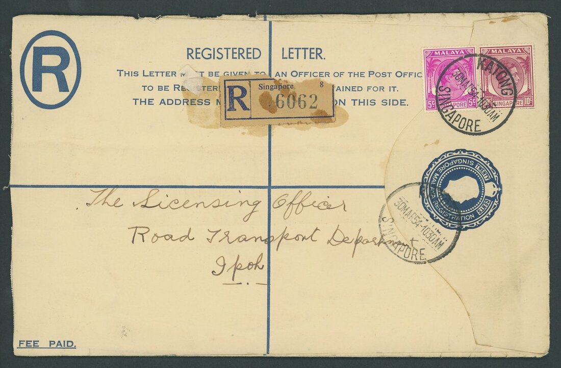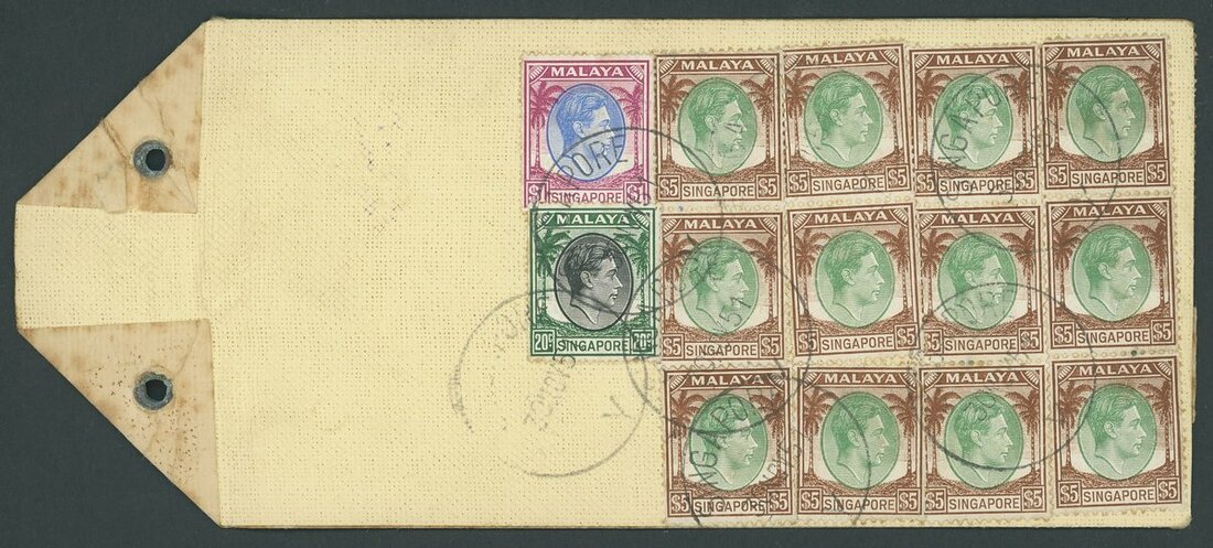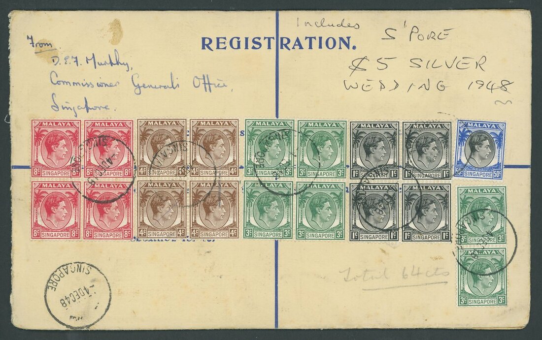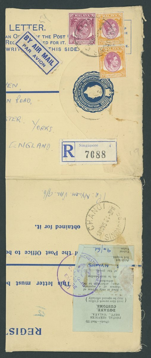 1948-54 20c. registered envelopes (10, two size ), 10c. stationery envelope (registered), 25c. Air Letters (6, two uprated), piece and a parcel label, variously addressed and franked, including an Official parcel label to London bearing 20c., $1 and perf 14 $5 (12), and items from Bukit Tanjong, Kampong Glam, Kandang Kerbau, Katong, Orchard Road, Sepoy Lines (2), Tanglin and Upper Serangoon. An interesting lot