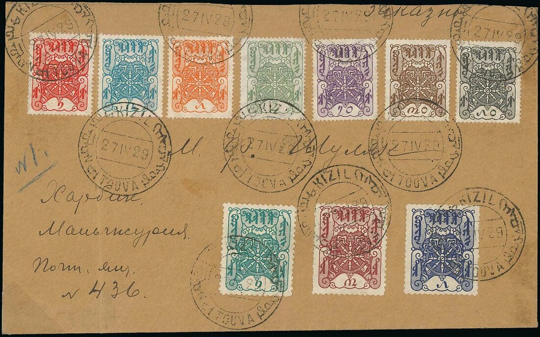1929 (13 Dec.) envelope registered from Kizil to Harbin bearing 1k. to 5r. set of ten cancelled by despatch bilingual c.d.s. and showing on the reverse arrival (27.4) c.d.s. A vertical fold at left still quite fresh and attractive. A very rare cover, 3r. and 5r. unpriced on cover in the Scott catalogue. Photo