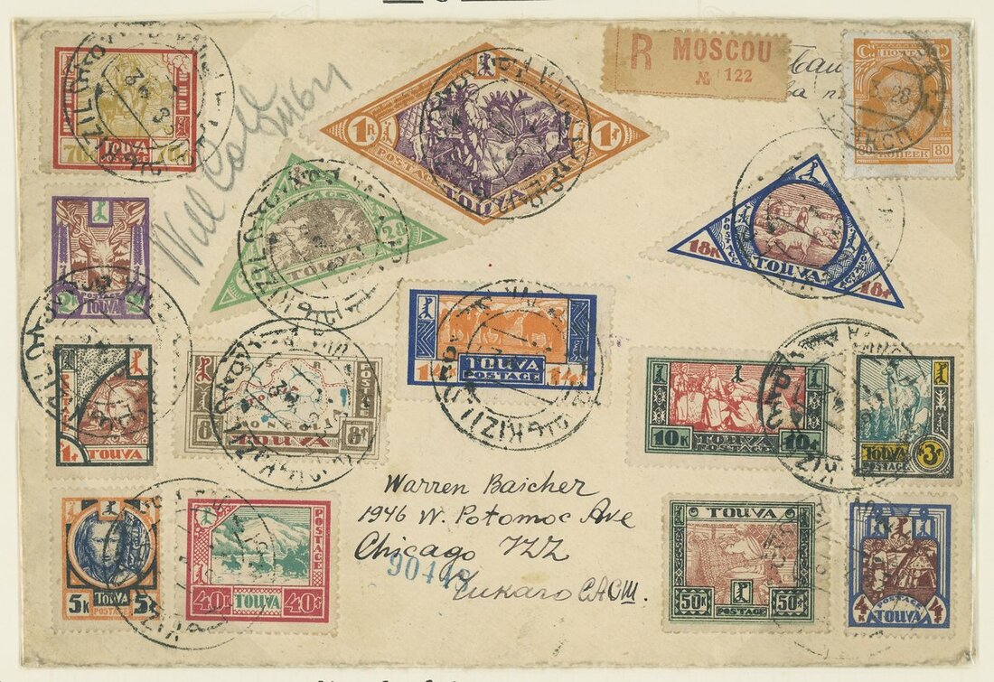 1927 (28 Nov.) envelope registered from Kizil to Chicago via Moscow bearing 1k. to 1r. set of fourteen cancelled by despatch c.d.s. in Moscow additionally franked with 80k. workers type stamp cancelled by Moscow (10.3) c.d.s. and with "Moscou" registered label applied. The reverse with transit New York (4.4) and arrival (6.4) c.d.s. A great rarity believed to be unique such combination)