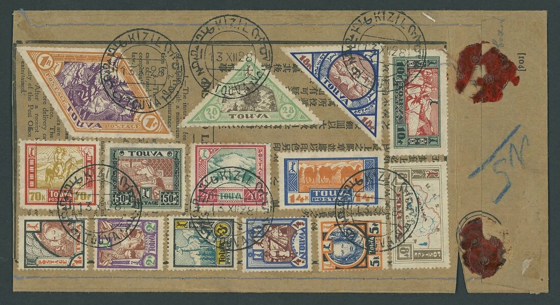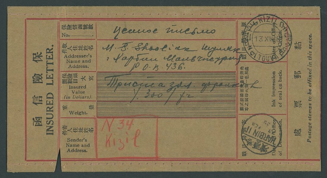 1928 (13 Dec.) Insured letter pre-printed cover in Chinese and English from Kizil to Harbin bearing on the reverse 1k. to 1r. set of fourteen cancelled by despatch c.d.s. The reverse with and arrival (23.2.29) c.d.s. Envelope with a vertical crease and a small piece cut out not affecting the adhesives, still quite fresh and rare