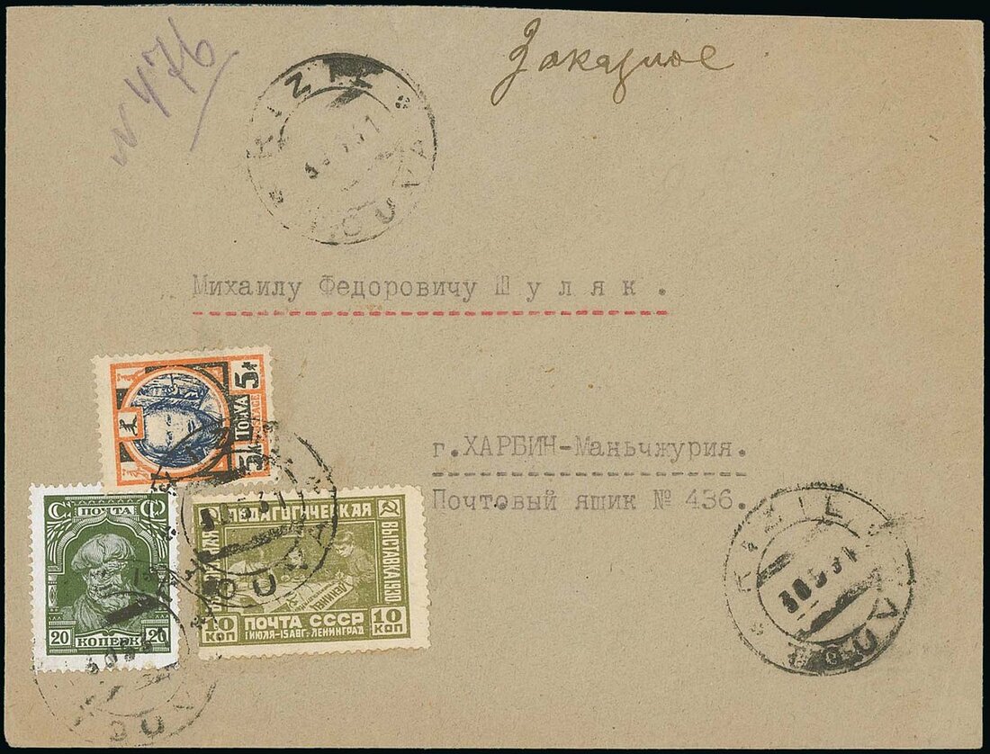 1931 (30 May) envelope registered from Kizil to Harbin bearing 5k. in combination with Russia 10k. 1st All-Union Educational Exhibition and 20k. workers type stamps cancelled by despatch c.d.s., the reverse with arrival (17.6) c.d.s. Very fine and the unique mixed franking of Russia and Tannu Tuva. Photo