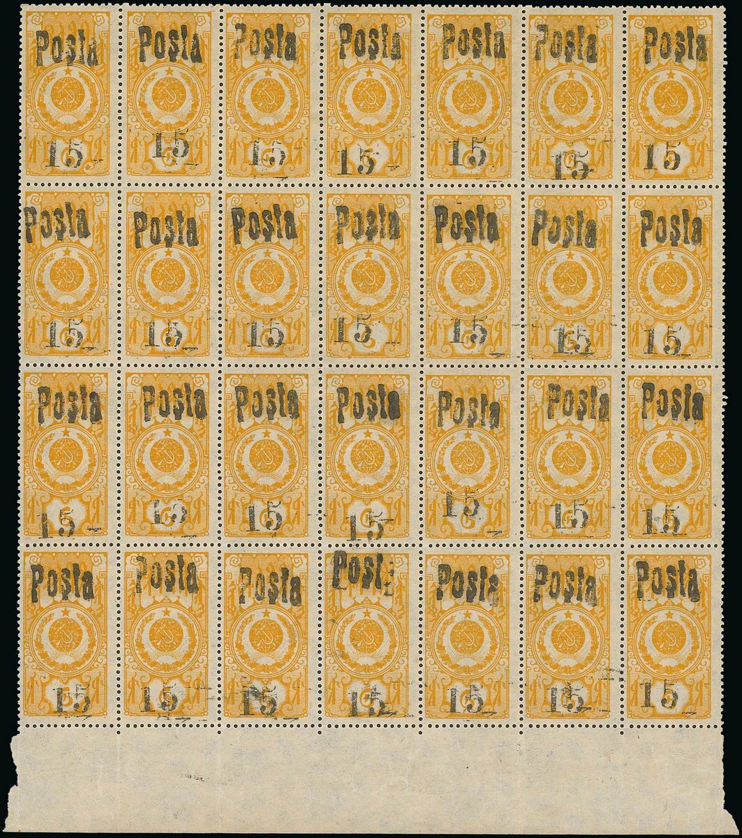 15k. on 6k. orange yellow large numerals block of twenty-eight (7x4) with sheet margin at foot, mostly unmounted mint, minor perfs separation at right and some tiny paper residuals on the reverse, otherwise fine and with fresh colour. A wonderful exhibition item and the largest recorded block of this value. Scott 39, 40, $8,400++. Photo