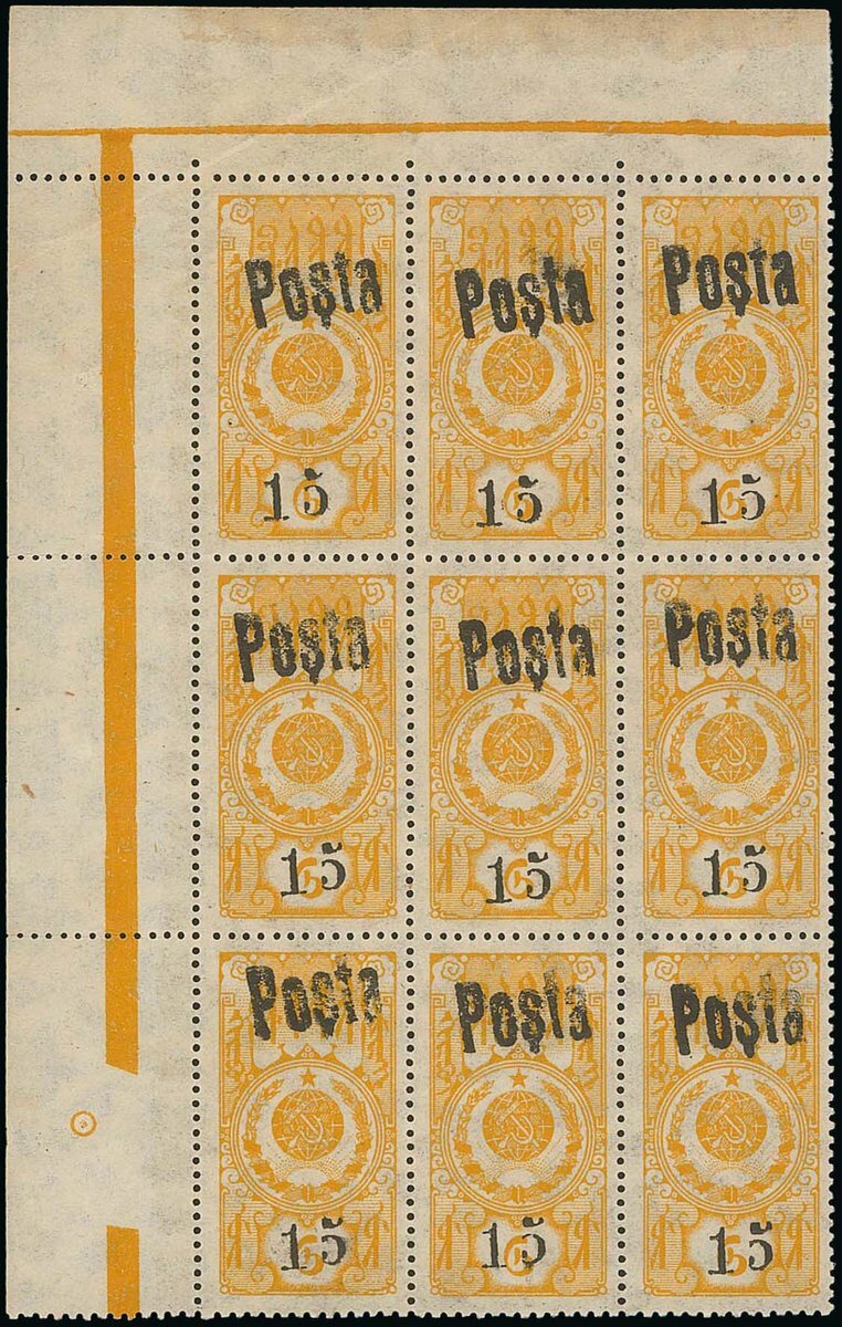 15k. on 6k. orange yellow small numerals upper left corner block of nine unmounted mint, mounted on the margin only, minor diagonal crease at top left (in margin only) and some tiny paper residuals on the reverse, otherwise fine and with fresh colour. A very rare block. Scott 41, $4,500++. Photo