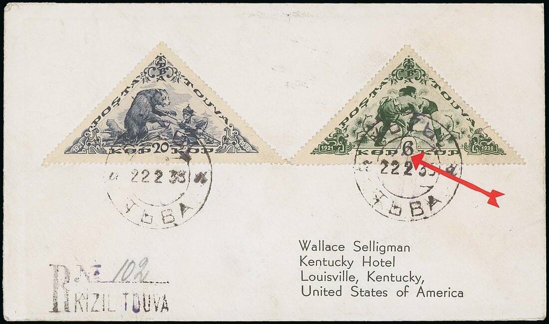 1933 (25 May) envelope registered from Kizil to Manchuria bearing 35k. on 15k. red brown small numerals cancelled by despatch c.d.s., the reverse with Lupin (2.7) and manuscript (6 VII); minor ageing and other small faults not detracting from the importance of this rare cover. The 35k. on 15k. listed but unpriced on cover in the Scott catalogue. Photo