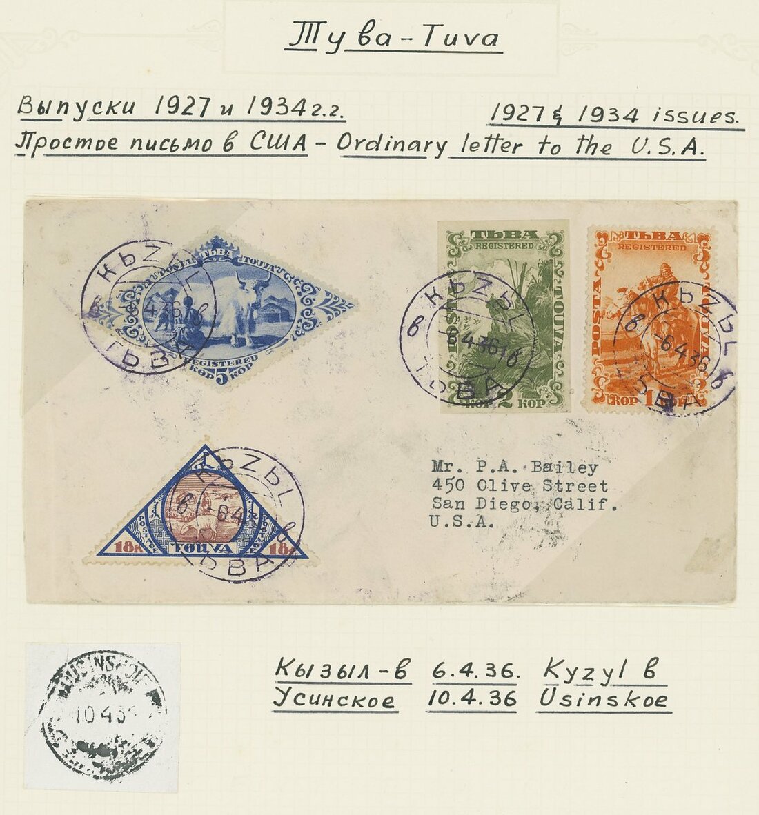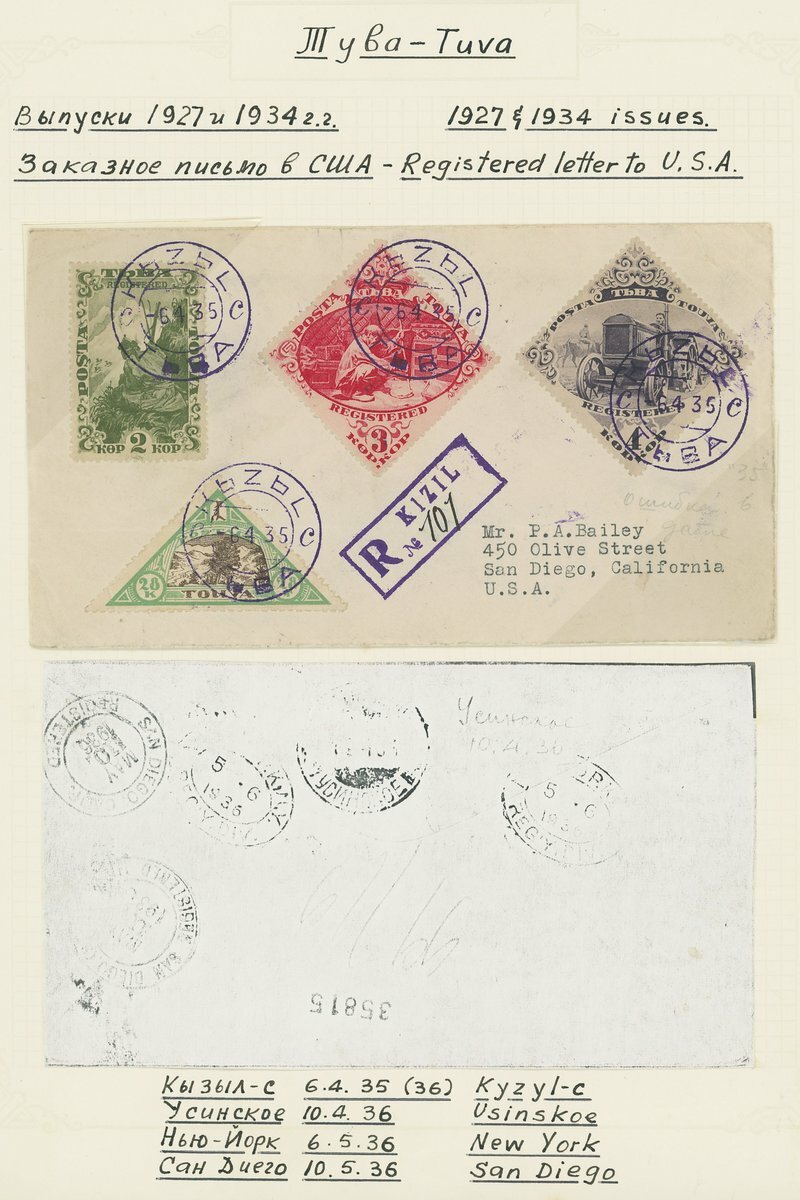 1936 (6 Apr.) two envelopes from Kizil to San Diego, USA the first registered bearing 2k., 3k., 4k., in combination with 1927 28k. cancelled by Kizil code 'C' c.d.s. for (6.4.35) error of date, the reverse with transit Usinskoe (10.4) and New York (6.5) and arrival (10.5) c.d.s. The other sent by ordinary mail bearing perforated 1k. and 5k. and imperf. 2k. in combination with 1927 18k. cancelled by Kizil code 'B' (very rare) c.d.s. the reverse with Transit Usinskoe (10.4) c.d.s. Mixed condition, a useful lot for the student of the subject.