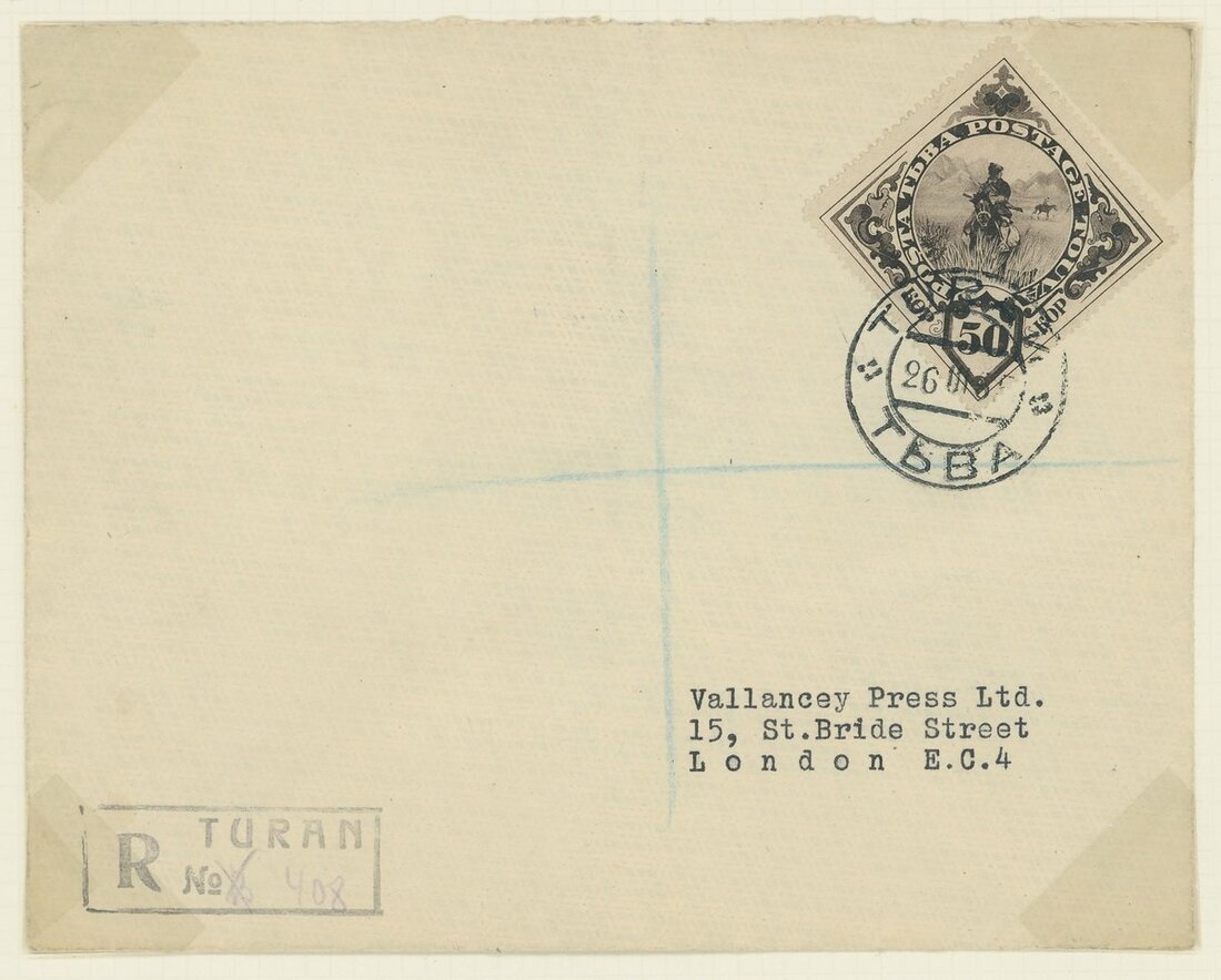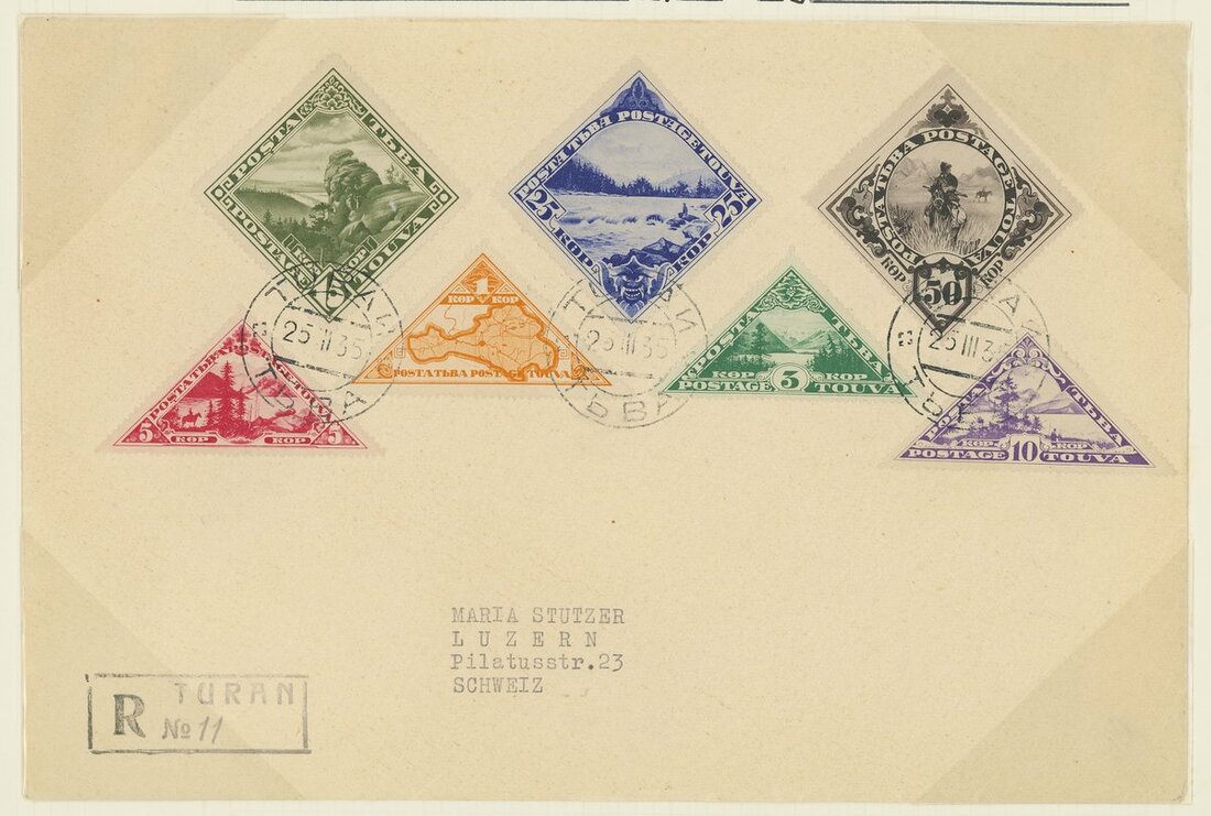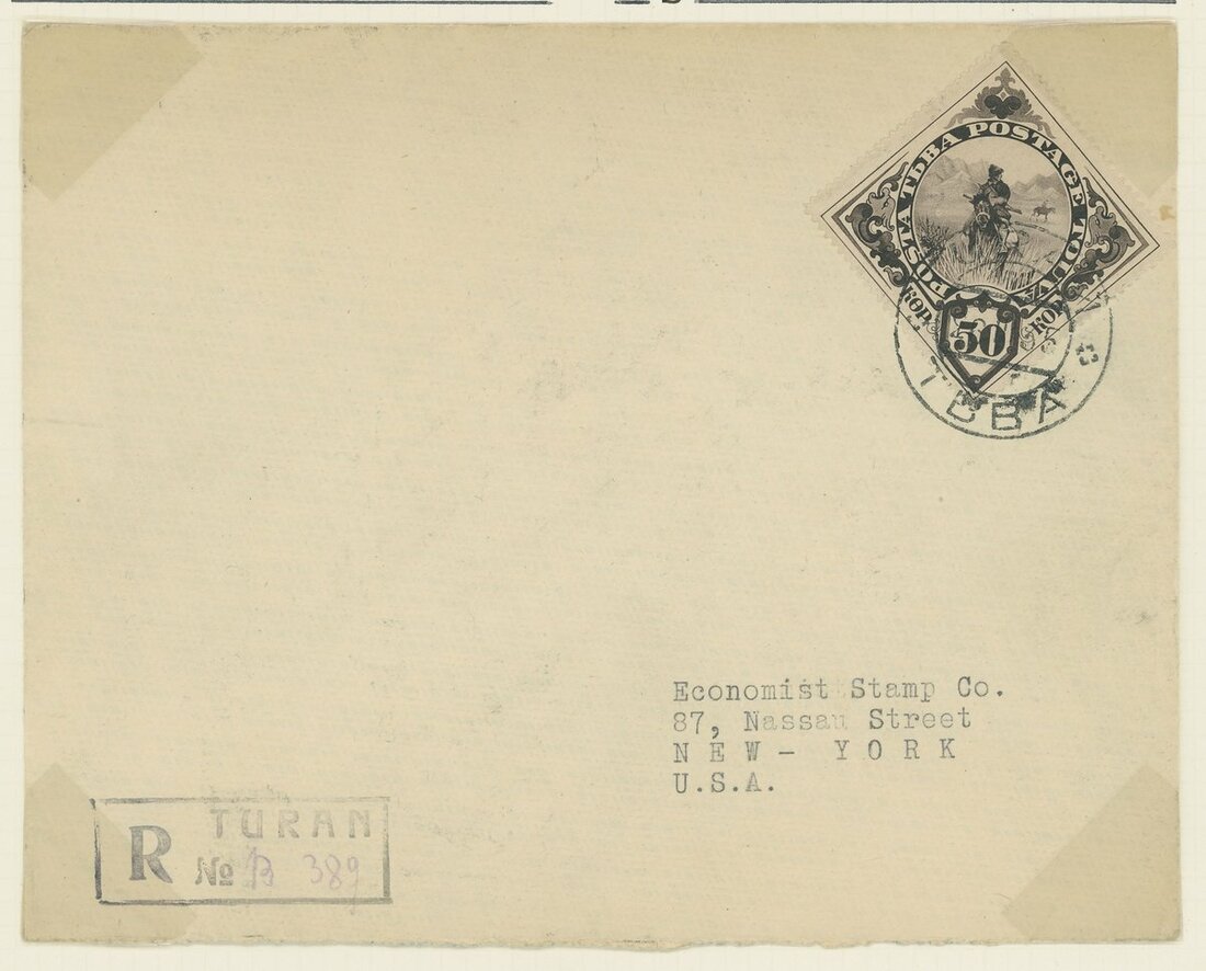 1935 postal history selection (14) arranged on exhibition pages, all registered, three envelopes bearing the 50k., and eleven envelopes 1k. to 50k. set of seven, addressed to Switzerland, England, Holland, Hungary, Italy, Czechoslovakia, Austria, USA, France, Spain, and Germany. All sent from Turan. Mixed condition. A very useful lot for the student of the subject.