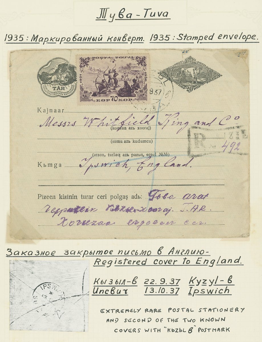 1937 (22 Sept.) 20k. postal stationery envelope uprated with 70k. plum, registered from Kizil to England cancelled by Kizil code 'B' (very rare) c.d.s., the reverse with arrival Ipswich (12.10) c.d.s.; some faults including a couple of tears at top, still quite fresh and an extremely rare postal stationery