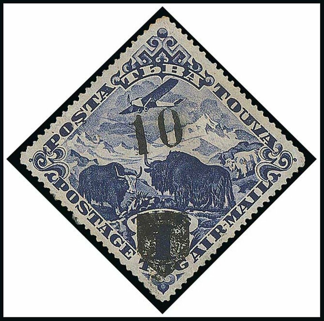 10k. on airmail 1t. royal blue unused without gum, some minor faults but an extremely rare stamp of which just a handful genuine stamps are known. Scott 104. Photo