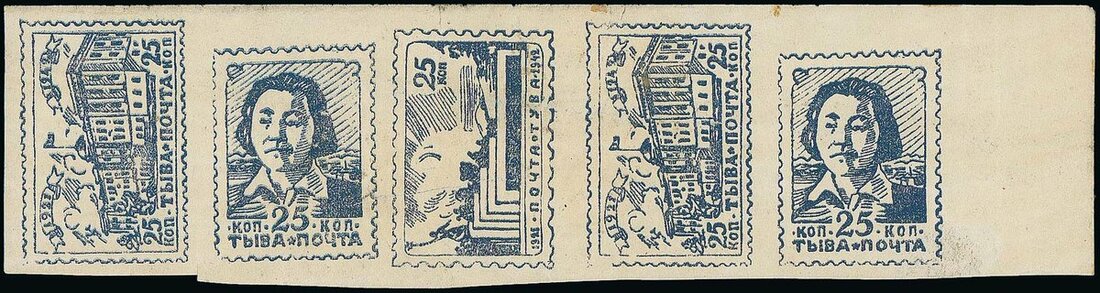 Complete sheetlet of five showing 25k. Government Building, 25k. Tuvan Woman, 25k. Exhibition Hall, 25k. Government Building, 25k. Tuvan Woman printed on thick paper, with characteristic original patchy yellow brown gum. Some faults including some creasing and a repaired tear between second and third stamp, still quite fresh and a great rarity believed to be one of the two complete sheetlet in existence. Photo
