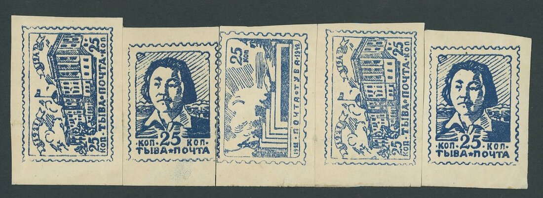 Reconstructed sheetlet of five showing 25k. Government Building, 25k. Tuvan Woman, 25k. Exhibition Hall, 25k. Government Building, 25k. Tuvan Woman printed on thick paper, with characteristic original patchy yellow brown gum and stamps hinged together. Some faults including minor creasing, some thinning and tiny paper residuals to the reverse still quite fresh and attractive. Scott 117-119, $4,750