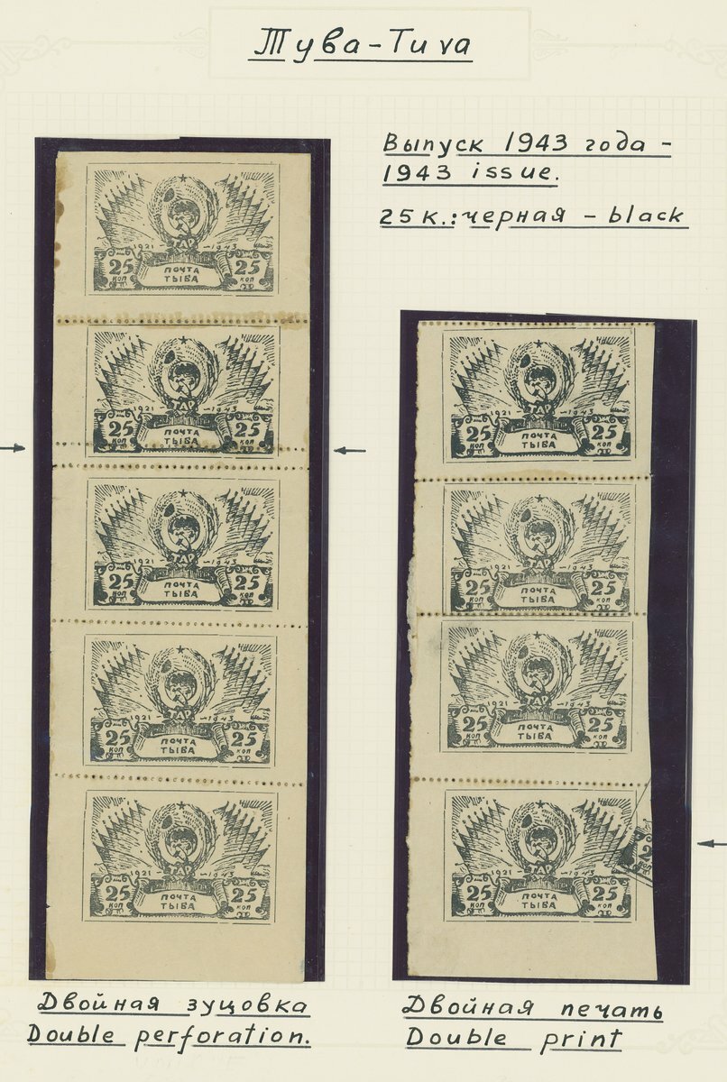25k. black on gummed paper a vertical strip of five with the second stamp showing variety doubly perforated and a vertical strip of four with the lower stamp showing a partial second print placed diagonally. Minor usual imperfections but generally fine. A rare and appealing selection