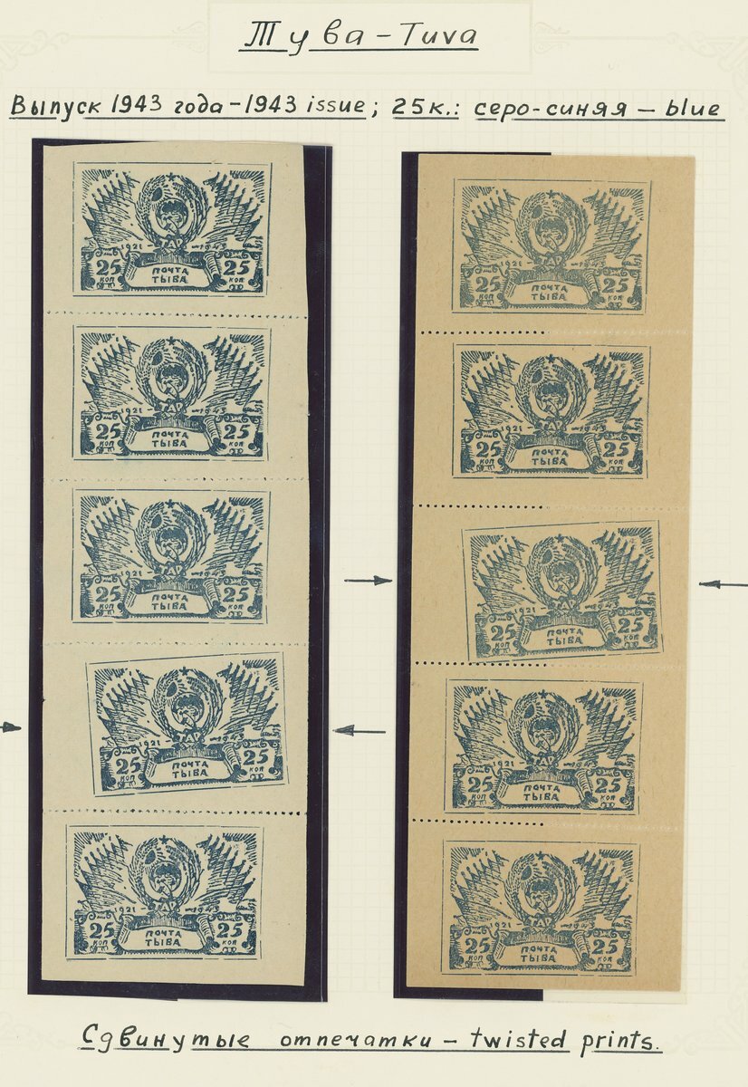 25k. blue two vertical strips of five on ungummed paper (one on white paper the other on buff paper) each strip showing one of the stamps printed with tilted cliche', generally fine and very rare variety