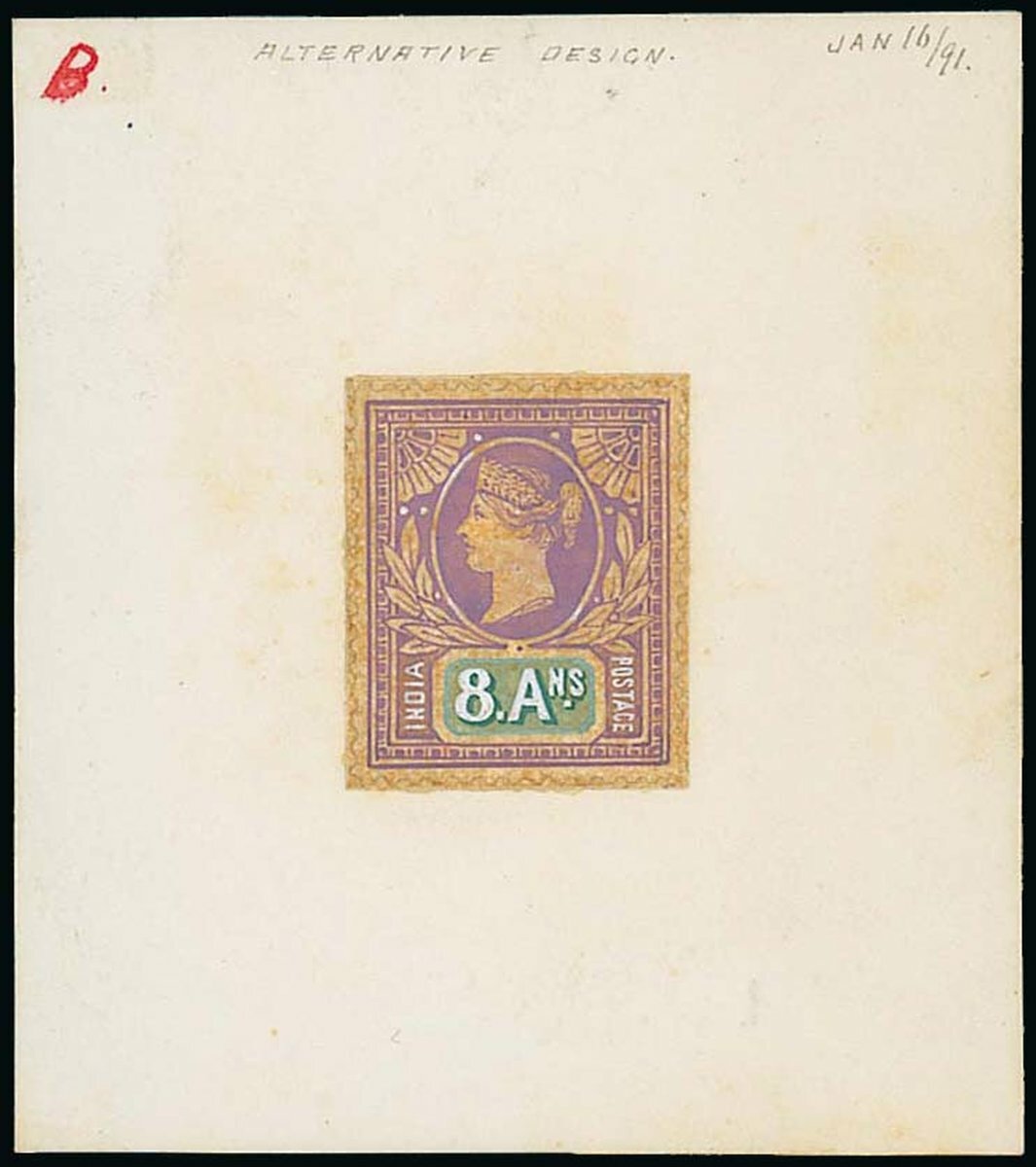 1892-97 8a. essay hand-pianted in violet and pale blue-green with portions of the design highlighted in Chinese white and with simulated perforations in pencil, on card (61x69mm.) lettered "B", marked