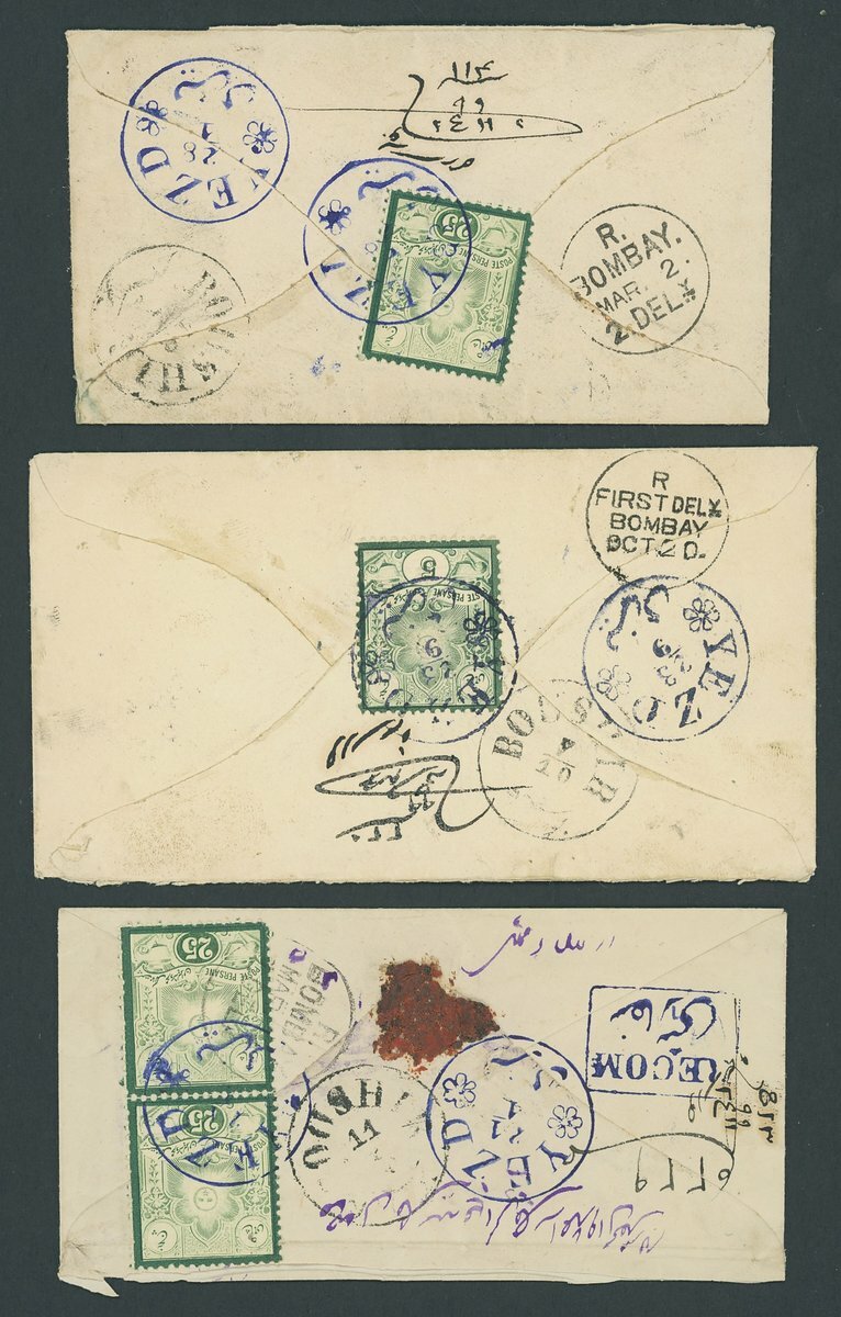 A selection arranged in two hagner pages including 1880s envelopes (3) from Yezd to Bombay via Bushire, one registered bearing 1881 engraved 25c. (3, single on the front and vertical pair on the reverse) cancelled by Yezd c.d.s. in blue with matching boxed