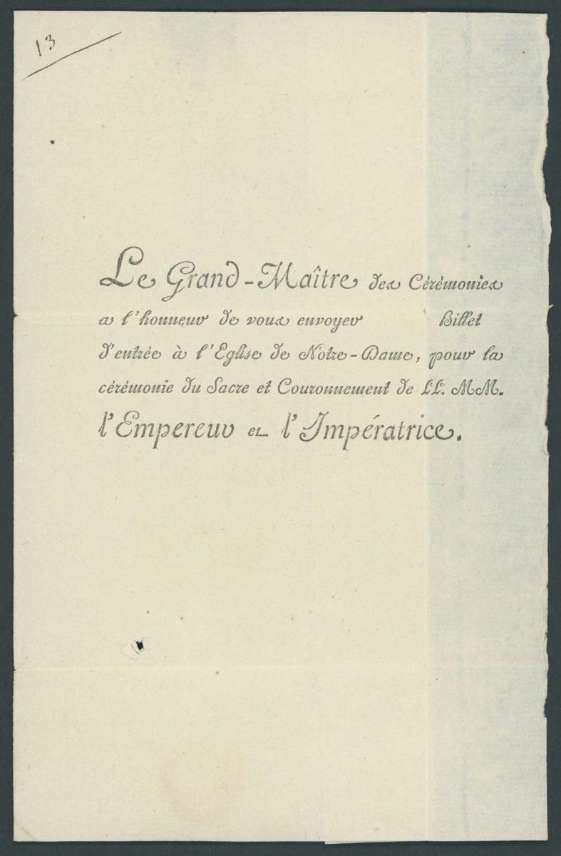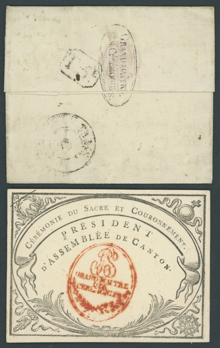 The entry ticket was enclosed in the accompanying folded letter addressed to a President of Cantonal Assembly. On the reverse of the letter appears a different black oval cachet of the Grand Master of Ceremonies (a type used between 1804 and 1810), along with a tax marking (likely applied due to the absence of the cachet on the front, which would have indicated postal exemption). Inside the folded letter is the following printed text: "Le Grand-Maître des Cérémonies a l'honneur de vous envoyer __ Billet d'entrée à l'Eglise de Nôtre-Dame, pour la cérémonie du Sacre et Couronnement de LL.MM. l'Empereur et l'Impératrice" (The Grand Master of Ceremonies has the honor of sending you __ admission ticket to the Church of Notre-Dame for the ceremony of the Coronation and Crowning of Their Majesties the Emperor and the Empress).