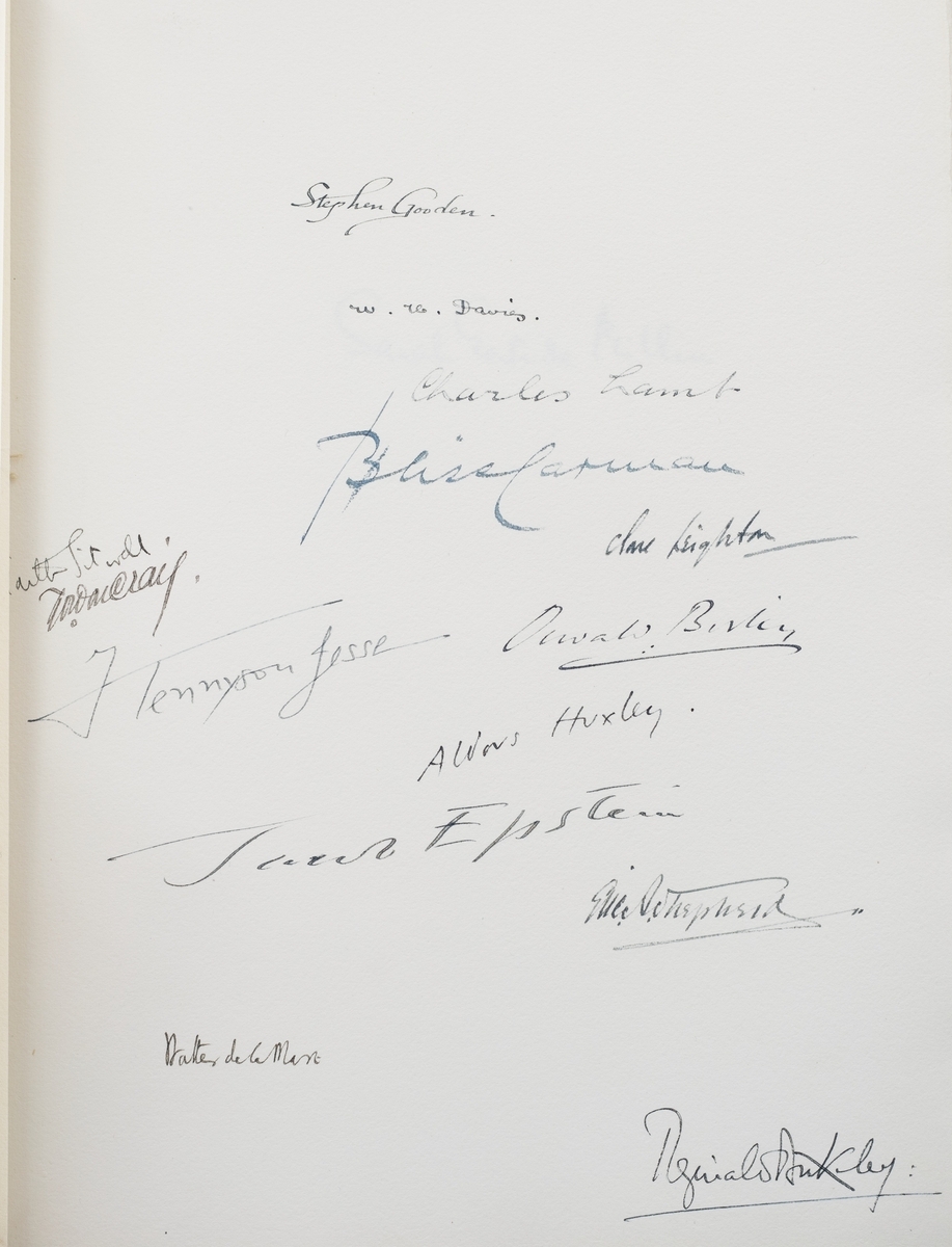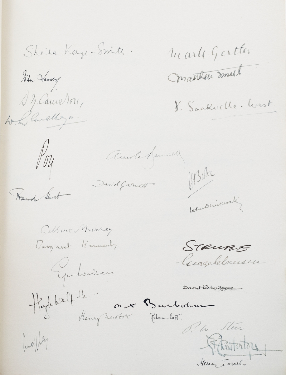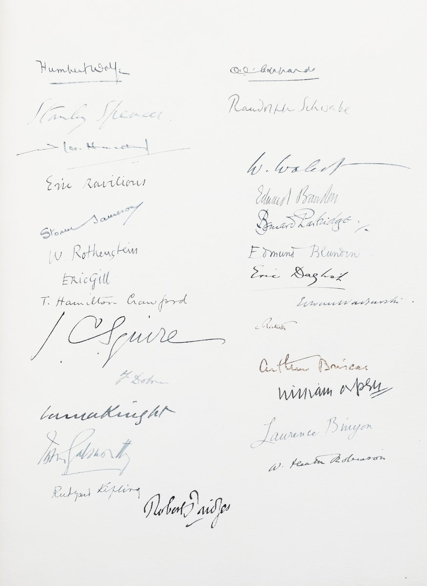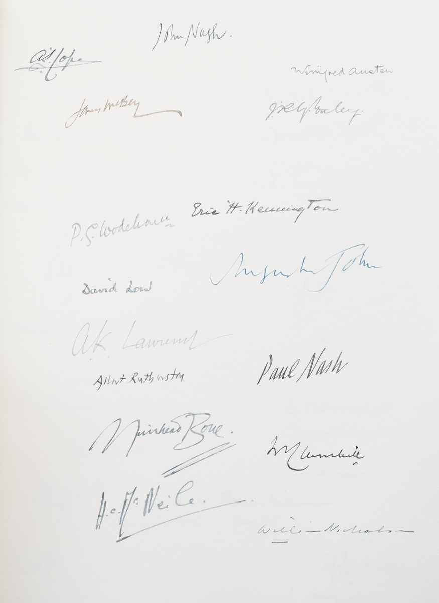 The signatories include Winston Churchill, Eric Ravilious, W. Rothenstein, Eric Gill, John Galsworthy, Rudyard Kipling, Edmund Blunden, William Orpen, Laurence Binyon, W. Heath Robinson, Robert Bridges, John Nash, P.G. Wodehouse, Eric H. Kennington, Augustus John, David Low, Paul Nash, William Nicholson, H. Belloc, Mark Gertler, V. Sackville-West, Hugh Walpole, Max Beerbohm, Rebecca West, G.K. Chesterton, Edith Sitwell, Oswald Birley, Aldous Huxley, Jacob Epstein, Walter de la Mare, Sarah Gertrude Millin, Prime Ministers Ramsay MacDonald, Stanley Baldwin, D. Lloyd George (opposite plate 3 by Beerbohm titled "Prime Ministers in my Day"), G. Clemenceau (opposite collotype 20). Printed by the Curwen Press, London on hand-made paper. A superb volume in wonderful condition, housed in a bespoke box numbered 78 in the top right corner.
