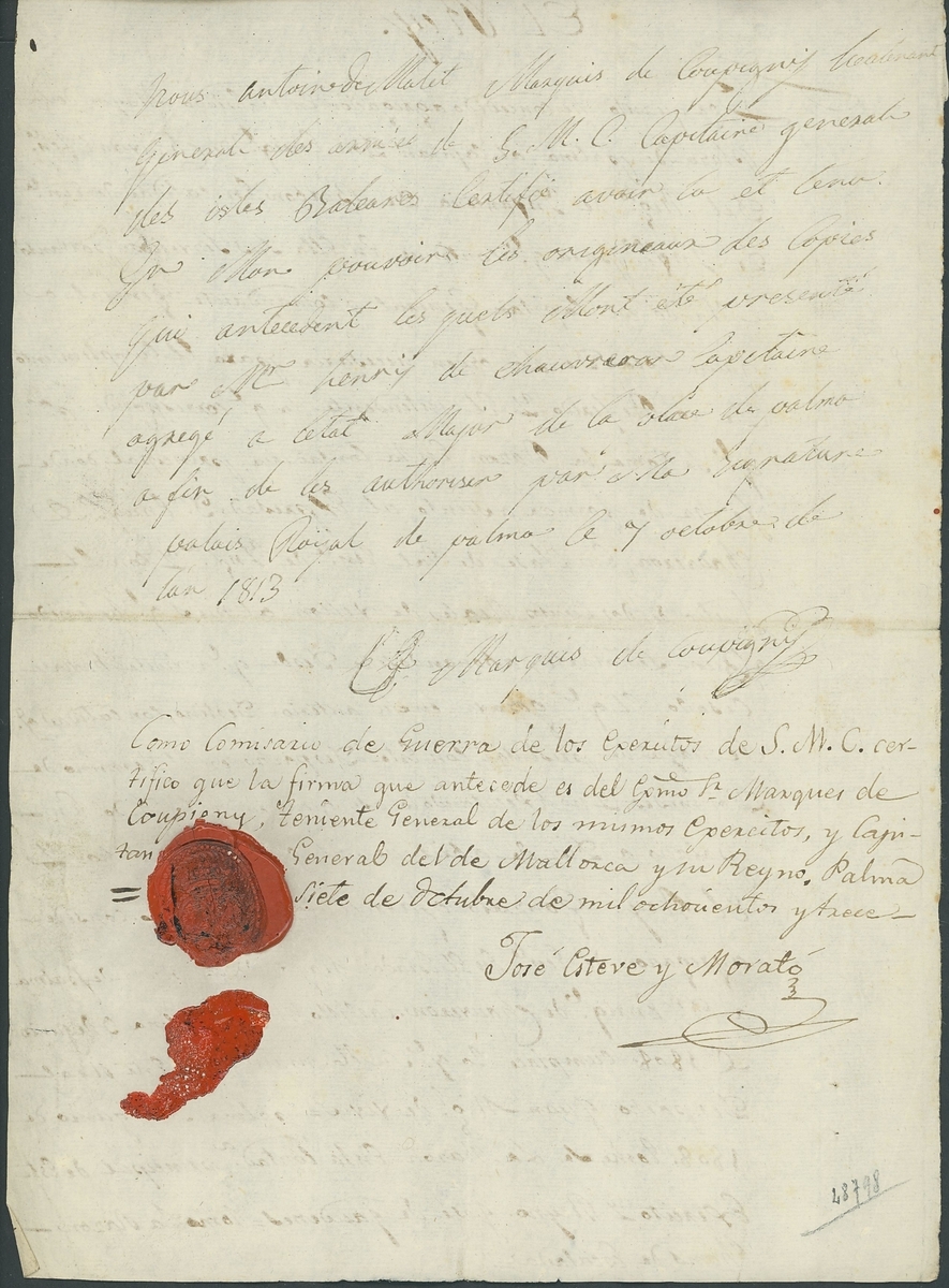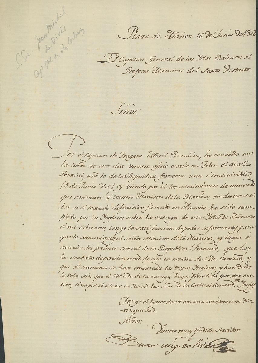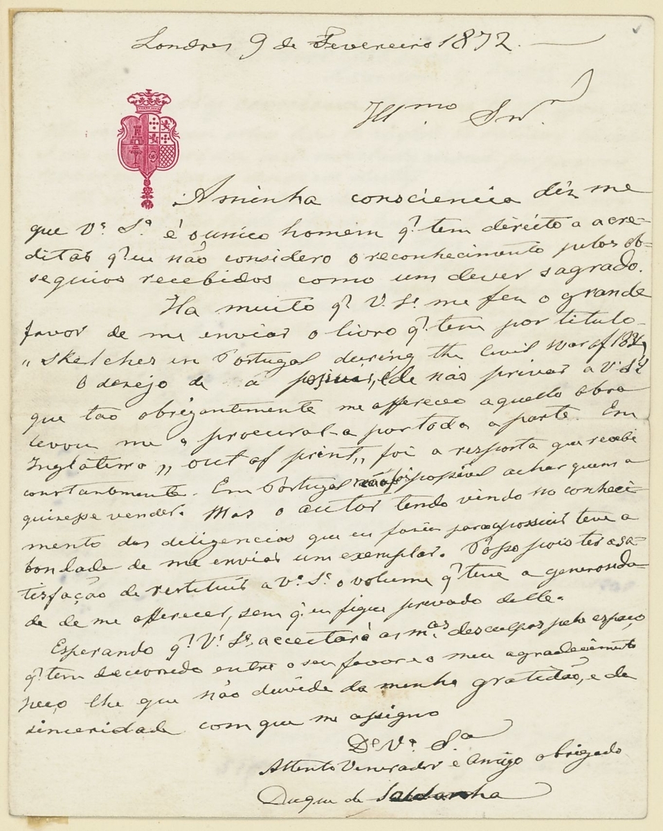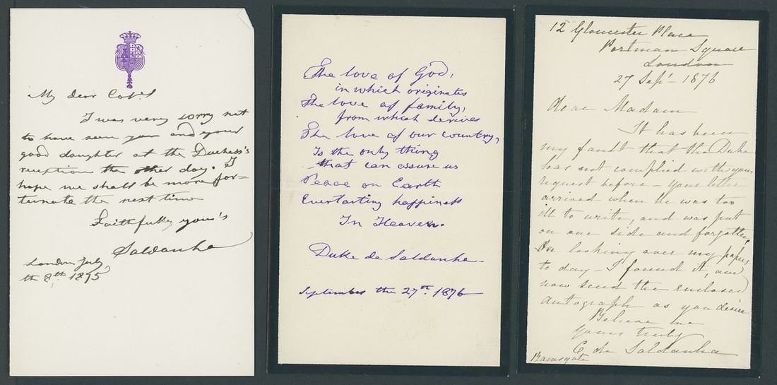 19th Century, a range of documents relating to Naval and Commercial activity at Lisbon including 1811 bound document titled "A Son Excellence Le Ministre Directeur de L'Oaminstation de la guerre", 1808 copy of letter from Sir Arthur Wellesley in Lisbon, 1876 autograph note from Duke de Saldanha (2), 1841 letter signed Lord Stuart de Rothesay at Lisbon, 1840 letter signed "Wellesley", and a range of Portuguese Ministers. Additionally letter signed "Jean Michel de Vives", document signed "Trebijano" by Don Manuel Maria Trebijano, France King Lous XVI document with secretarial signature. An interesting group ex Myers and Co. auctions
