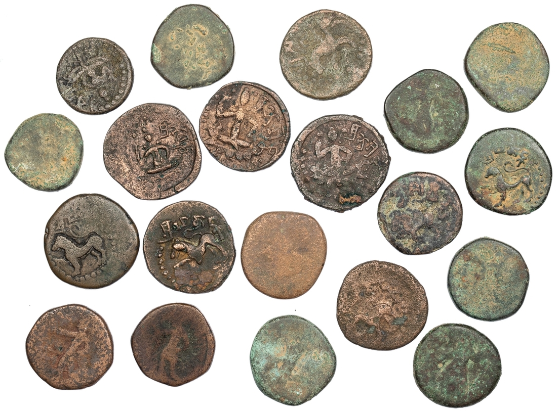 Kushan Empire, Group of Coins (6), in very worn condition, good/very good; further, Kushan Empire, copper coins (4), mostly too worn to allow the name of the ruler to be identified, good/very good; In the name of Sri Mananka (576-605), uncertain denomination [Pana], copper-iron alloy or bronze (9), undated (RGV 1-7), very good (19)