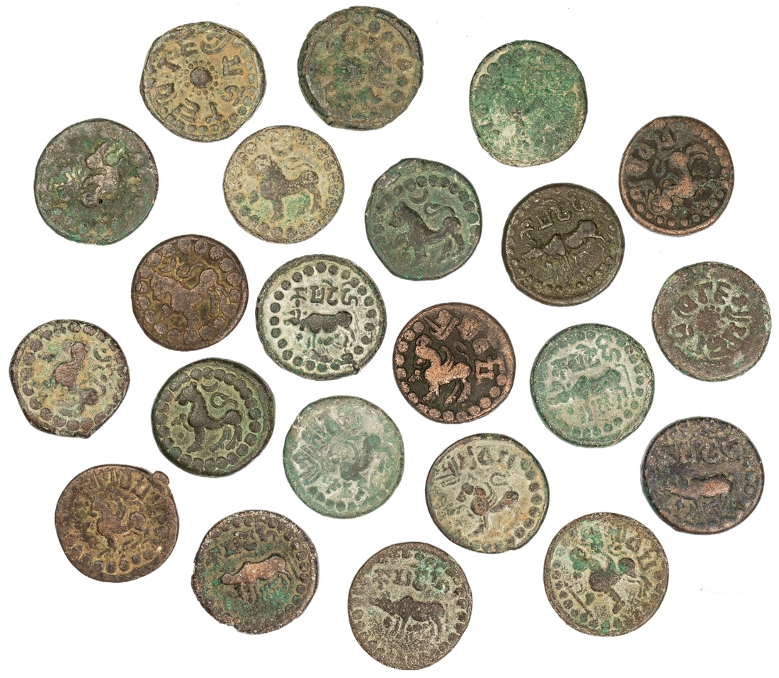 Amshuvarman (c.605- 621), Pana, copper alloy (5), Obv. winged lion with front paw raised, legend Śriya?śoh, within border of dots, Rev. sun symbol in centre and around legend Maharajhirajasya (“great king of kings”), two syllables breaking border of dots, slight die variants (RGV 17), some corroded, most very fine ; Pana, copper alloy (8), Obv. winged lion with legend, Rev. winged lion with crescent, (RGV 21-24), very good to good fine; Pana, copper alloy (8), Obv. winged lion and legend, Rev. cow with calf (RGV 25-28), very good to very fine; Pana, copper alloy, Obv. winged lion with front paw raised, facing left, a thinly drawn standard with two ties to right of shaft in front of lion, legend above Śriya?śuvarma, breaking border of dots, Rev. cow with calf below and legend Kamehi above, all within dotted border (RGV 29), very fine and rare (22)