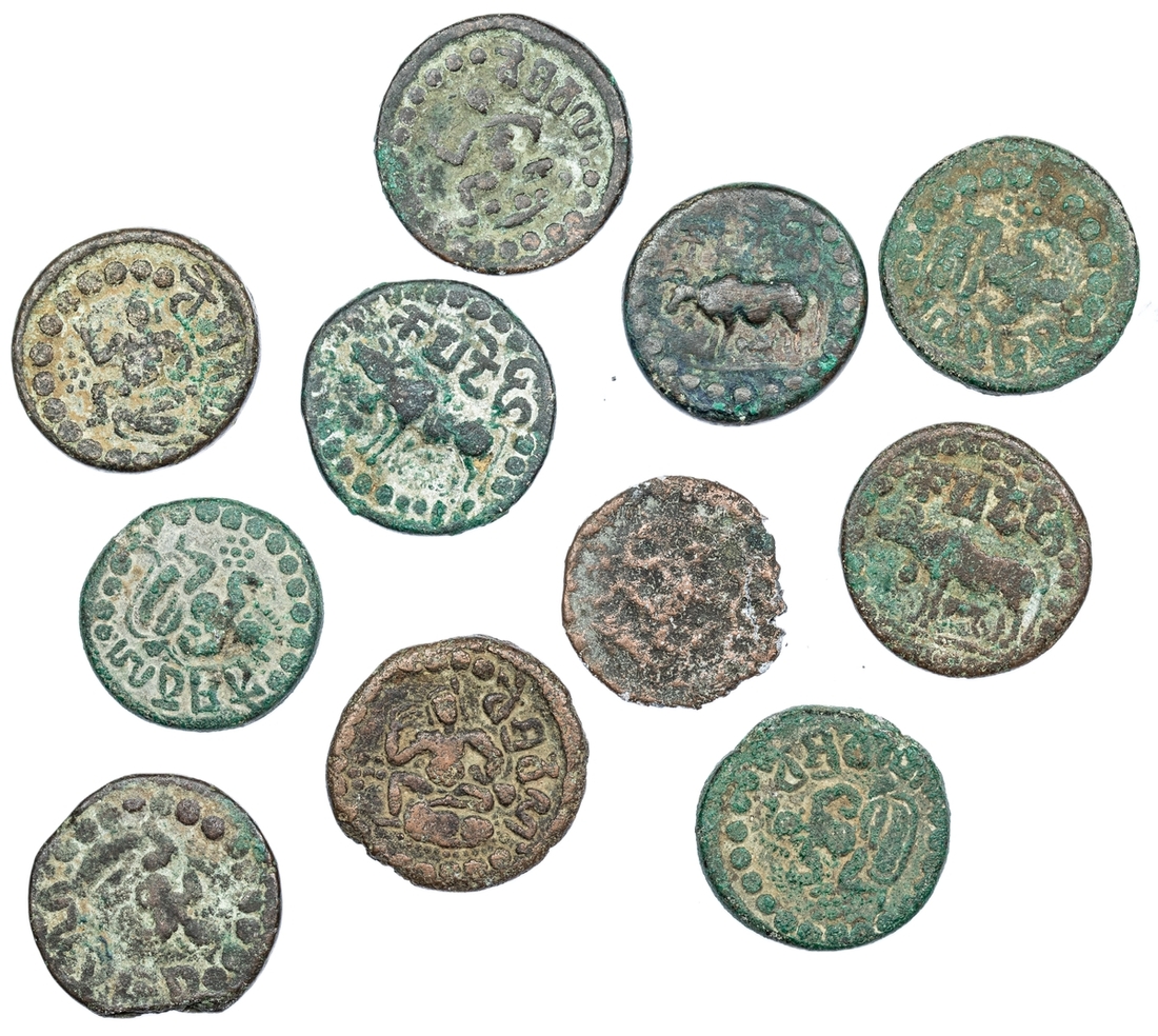 Anonymous, (Udayeva?), Pana (11), copper alloy, undated (c. 621), Obv. Kuvera, god of wealth, seated in ‘lalitasana’ the position of joy or relaxation, with one leg tucked under the body and the other dangling down, the right arm in ‘abhayamudra’ (position of “have no fear”), the left bent on the waist, holding a purse. Flower of dots to left, legend Vaiśravanah above, breaking the dotted border, Rev. cow with suckling calf facing left and legend Kamehi above (RGV 31-34), two very most fine or worst with corrosion (11)