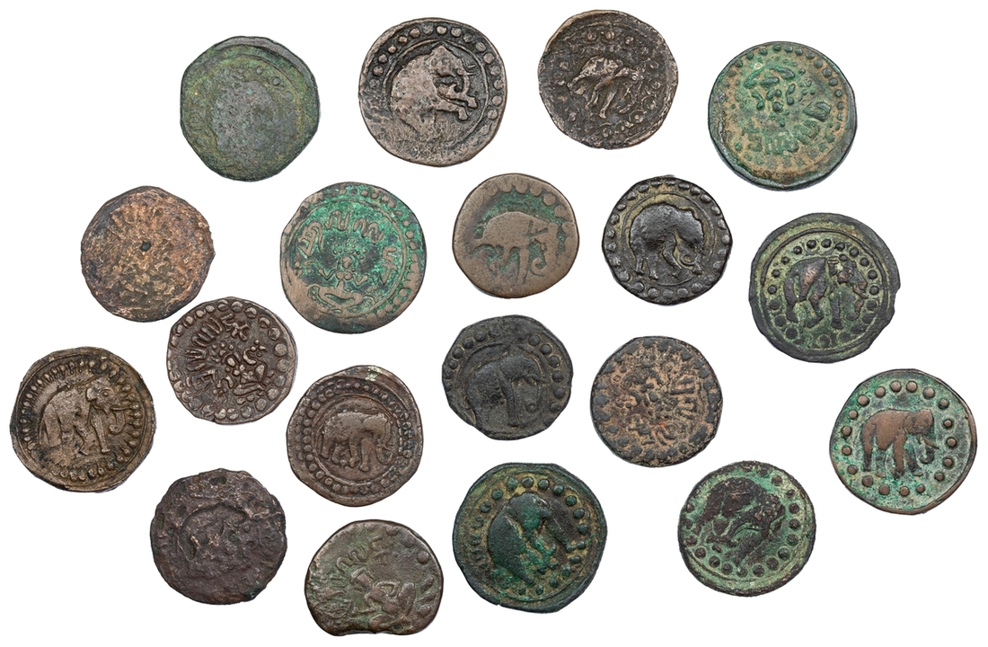 Anonymous (625-641), Pana, copper alloy (19), Obv. standing elephant facing right within border of dots, Rev. Goddess Lakshmi, seated cross-legged facing and holding flowers in each hand, legend, Śrī Gu?ānka, (RGV 52-82), a good variety of later types, very good to very fine (19)