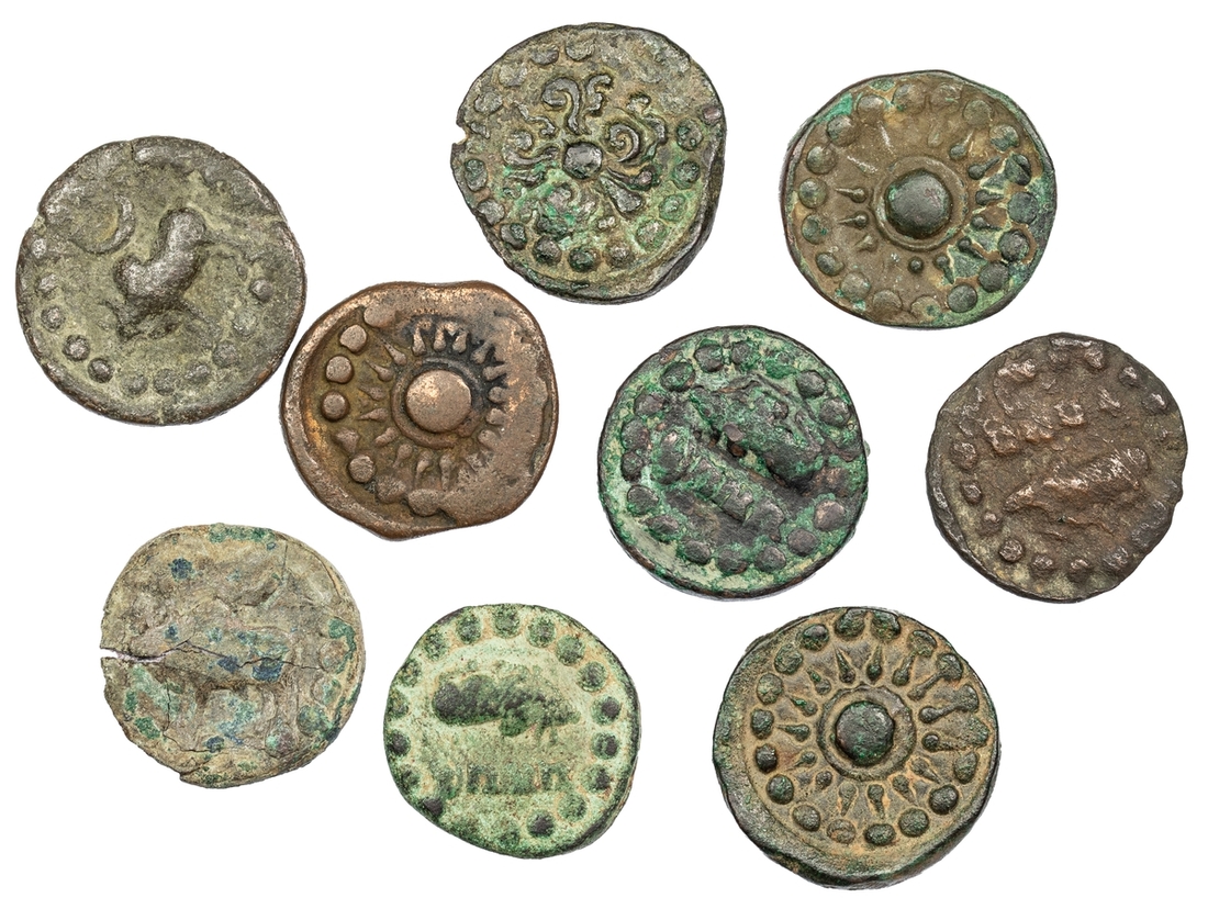 Anonymous (c.641-680), Pana, copper alloy (4), Obv. recumbent bull with raised head, facing left, legend Paśupati above and border of dots around, Rev. circle around central part of sun, all within border of dots (RGV 85), the first about extremely fine and very rare in this condition, others good fine and poor; Pana, copper alloy (3), Obv. recumbent bull facing left (2); right (1), legend Paśupati above and border of dots around, Rev. Śrīvatsa within border of dots (RGV 89-92), about fine to very fine and scarce; Pana, copper alloy (2), Obv. standing bull facing left, moon above, Rev. sun with legend Paśupati around (RGV 93-94), fine and poor, both with a degree of corrosion (9)