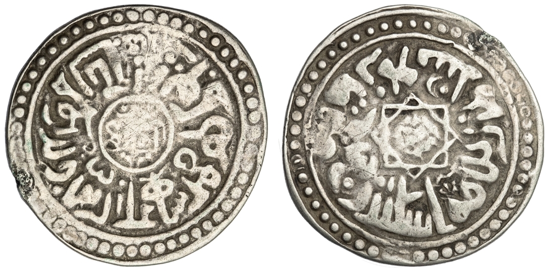 Nepal, anonymous, Tanka, undated, in the style of 'Ala-Ud-Din Khilji', Obv. central circle with Śrī Śrī, mace with garland above and pseudo-Arabic script around, Rev. lion within two intersecting triangles and pseudo-Arabic script around, 9.75g (RGV 192 var.), previously mounted, fine