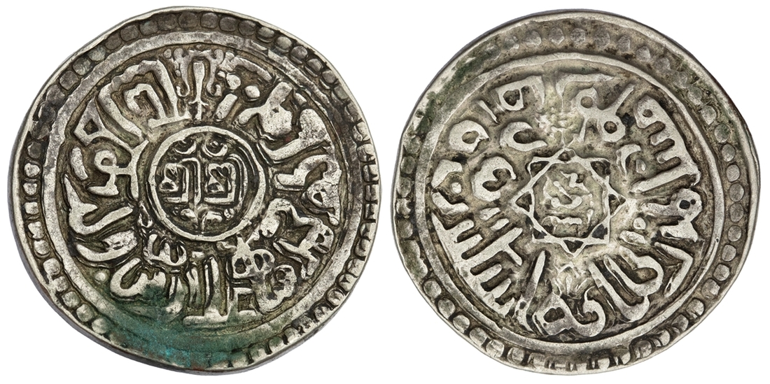 Nepal, anonymous, Tanka, undated, 'Ala-ud-Din' Type, Obv. sword with garland above central circle, small conch outside of central circle at 8 o’clock, Rev. lion within two intersecting triangles and pseudo-Arabic script around, 10.21g, 12h (RGV 200 var.), with some verdigris and double-struck, about very fine