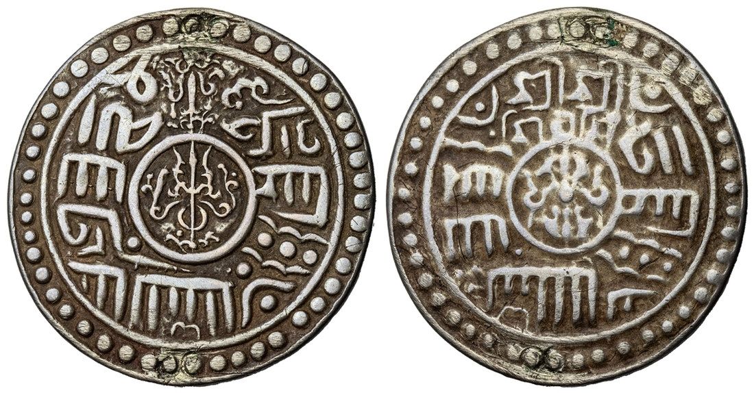 Nepal, Kathmandu, Siva Simha (c.1578-1619), Tanka, undated, 'Ghiyas-ud-Din' Type, Obv. trident in central circle, around crudely copied inverted Arabic script, sword with ornamental garland above, Rev. vajra (thunderbolt) in central circle, above inscription in Newari, Śrī Śrī/ Śivasi?, around the lower part of the central circle crudely copied Arabic script, 10.13g, 12h (RGV 206 this coin), previously mounted, very fine, better to obverse
