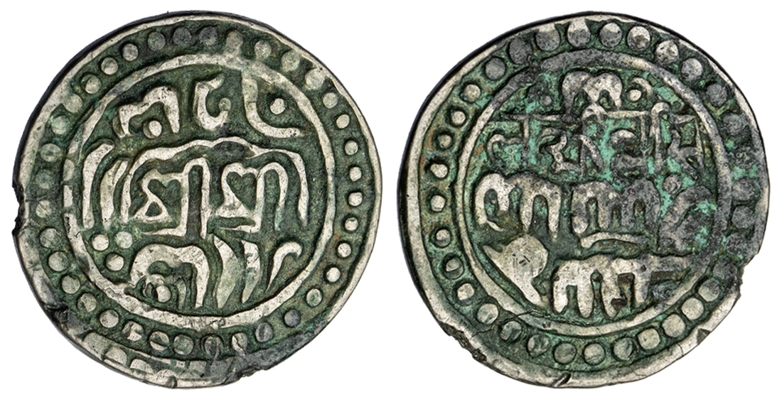 Nepal, Kathmandu, Lakshmi Narasimha (1619-1641), Quarter-Tanka, undated, Obv. circle surrounded by dotted border, legend Śrī Śrī in centre and pseudo-Arabic script above and below, Rev. circle surrounded by dotted border containing pseudo-Arabic script except in the upper part which bears a legend in Newari, Lak?mī narasi?, 2.07g, 12h (RGV 221), with verdigris, plugged hole, otherwise very fine and extremely rare