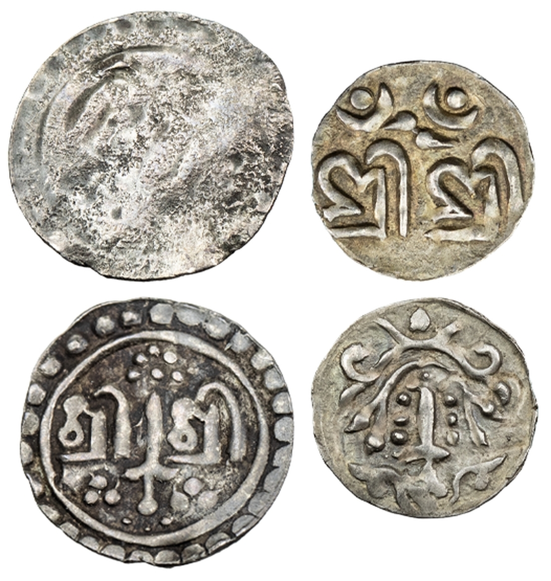 Nepal, anonymous, Dam of Tanka standard, undated (2), Obv. Śrī Śrī with small device [flower?] above, crescent and dot above each syllable, Rev. sword with garland and flowers above and by base, 0.12g, 12h (RGV -), very fine; another, Dam of Tanka standard, Obv. letter Śrī, Rev. garlanded mace, 0.14g (RGV 229 this coin), reverse pitted and worn, fine (2)