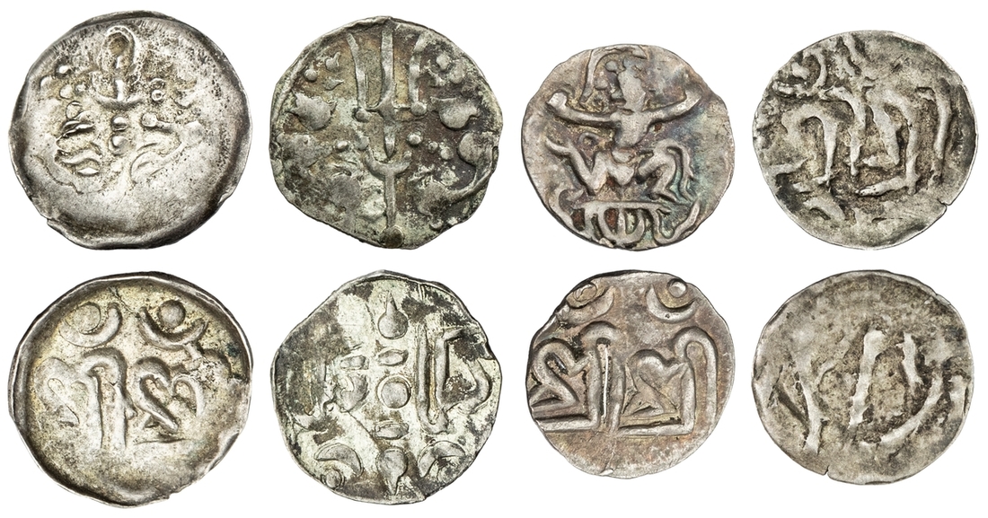 Nepal, anonymous, Dam of Tanka standard, undated (3), Obv. Śrī Śrī with crescent and dot above each syllable, Rev. Sword [?] and two winged lions sitting on either side, facing outwards (RGV 237 this coin), very fine; Dam of Tanka standard, Obv. Śrī Śrī; Rev. Hanuman on dais, leaping right (RGV 238 this coin), good very fine; another, Obv. vajra between two letters, Rev. trident between two lions, (RGV 240), good fine; another, similar to previous coin, Rev. design unclear (RGV 243), fine (4)