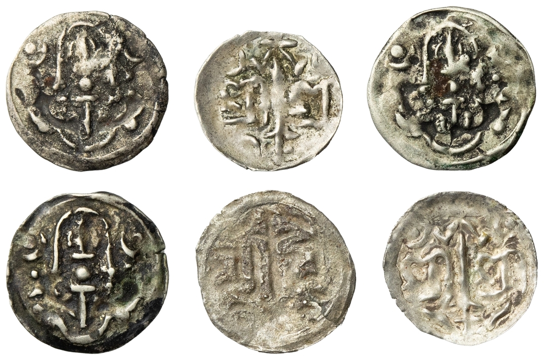 Nepal, anonymous, Dam of Tanka standard (3), undated, Obv. sword with canopy and mace with garland, arranged vertically, one below the other, Rev. Śrī with group of three dots on either side, below two standing lions facing outwards (RGV-), very fine or better; Dam of Tanka standard (2), undated, Obv. sword with canopy between Śrī Śrī. Rev. design of obverse shows through (RGV 245), good fine; and, Dam of Tanka Standard, undated, Obv. sword with canopy between two letters, Rev. traces of design with mirror (RGV 244) (6)