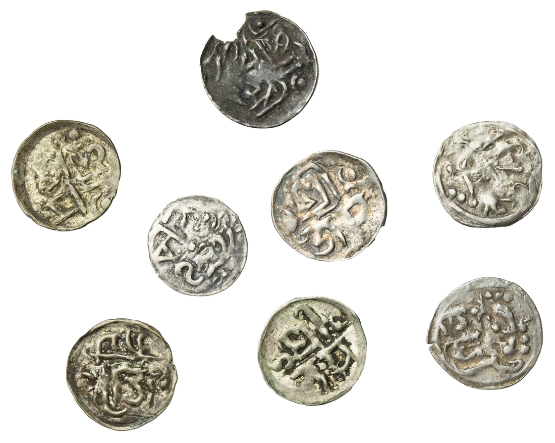 Nepal, Shiva Simha, king of Patan and Kathmandu (1574-1619), Dam of Tanka standard (2), undated, Obv. Śrī/Jaya, crescent and dot each side of Śrī. Rev. Śiva over lion (simha); and, Dam of Tanka standard (6), Obv. Sri Lakshmi, Rev., Nara, with much ghosting so reverse unclear (RGV 247/252; KM 137), good, fine and very fine, scarce (8)