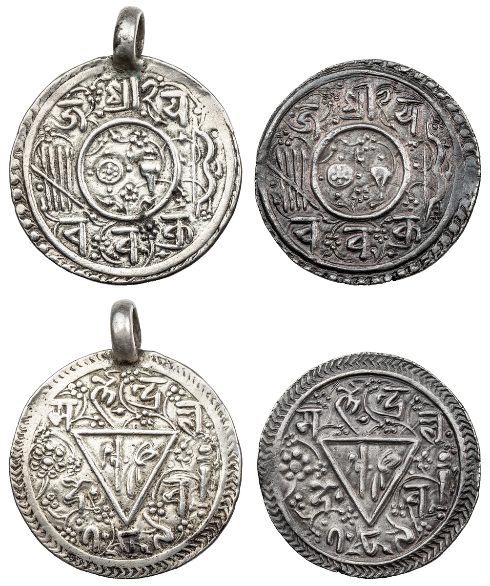 Wright references the first coin in: History of Nepal, Translated from, Parabatiya, 3rd ed. Calcutta, 1966, p. 149. "By one Swami's (mendicant) vice Pratapa Malla of Kathmandu left his throne for a time to be filled in turn by his four sons, for one year each (during ca. A.D. 1668). Chakravartendra Malla's coin, devised by this Swami, consists of a triangular Banastra (bow and arrow), Pasha (a noose), Ankush (the iron hook for driving an elephant), Kamal (a lotus), Chamar (a yak's tail), and Sambat 789 (A.D. 1669). This vice caused his death."