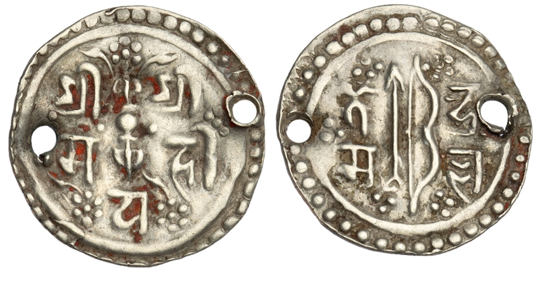 Nepal, Mahipatendra Malla (c.1670), Suki (Quarter-Mohar), undated, Obv. thunderbolt (vajra) in centre and the legend Śrī Śrī /ma hi/ pa, Rev. arrow and a bow in centre, legend continues te ndra/malla, 1.37g, 12h (RGV -), pierced twice and with some resulting crimping through flan, with red some deposits, otherwise almost very fine and extremely rare, perhaps the only specimen existing in western collections