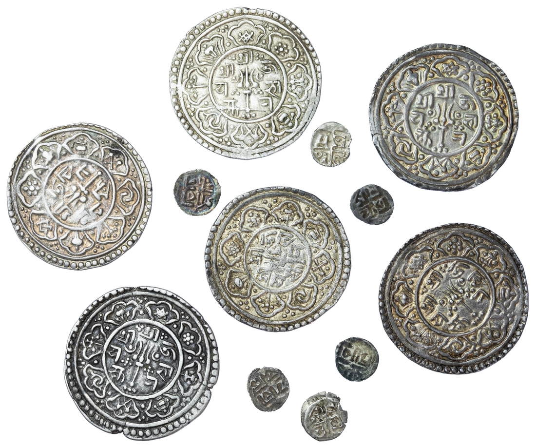 Nepal, Jaya Bhaskara Malla (1701-1715), Mohars (6), NS 821, Obv. trident and legend in four lines: Śrī Śrī/ Jaya/Bhāskara in central circle, one each of the eight Buddhist auspicious emblems (astamangala) in the eight petals attached to the inner circle, Rev. two horizontal lines, possibly representing two pseudo-Persian characters within central circle, sword with garland in centre and legend in three lines Malla/Deva/821, one syllable each of the legend: Nepāleśvara Girindra (Lord of Nepal, King of the Hills), in the eight petals which are attached to the circle, with variants (RGV 289, 290, 293, - ; KM 217), including some scarce types, mostly toned, very fine to extremely fine, the unlisted Mohur previously mounted; uniface Dams (6), undated, legend in two lines, Śrī Bhā/ skara (RGV 302; KM 211), very fine (12)