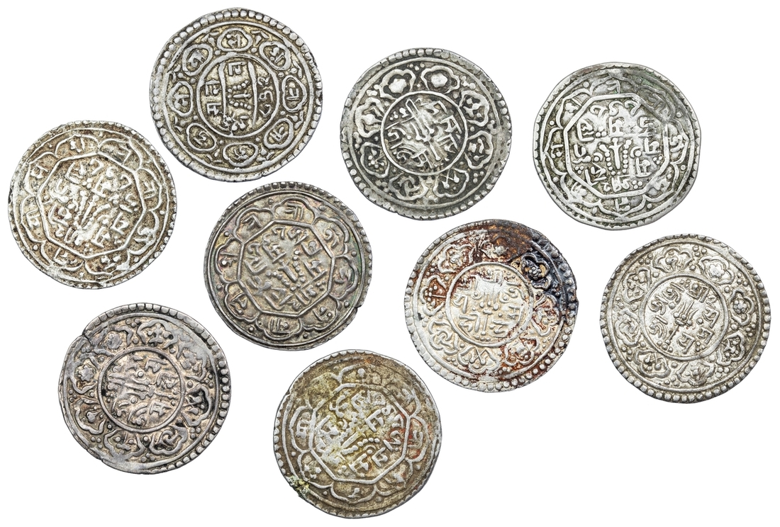 Nepal, Jaya Jagajjaya Malla (1722-1735), Mohar (9), NS 842 (3), Obv. trident and legend in four lines Śrī 2/ Jaya/Jagajjaya in central circle, one each of the eight Buddhist auspicious emblems (astamangala) in the eight petals which are attached to the inner circle, variants to number of dots in field and under trident, Rev. two horizontal lines, possibly representing two pseudo-Persian characters within central circle, sword with garland in centre and legend in three lines Malla/Deva/842, one syllable each of the legend Nepāleśvara Rājendra in the eight petals attached to the circle; Mohar, NS 848 (6), Obv. trident and legend in four lines, Śrī 2 /Jaga/jjaya/Malla in central circle, three dots below trident, and left of Śrī, and one dot on each side of the trident, one each of the eight Buddhist auspicious emblems (astamangala) in the eight petals which are attached to the inner circle, Rev. sword with garland within octagon and legend in five lines, Śrī 2/Māhipate/ndra Malla/848, three dots to the left of Śrī, one syllable each of the legend Nepāleśvara Rājendra in the eight petals attached to the octagon, three die types (RGV 313, 314, 315, 316, 317, 318; KM 231), very fine to about extremely fine, the second a rare variant, the RGV 317 types both with edge nick (9)